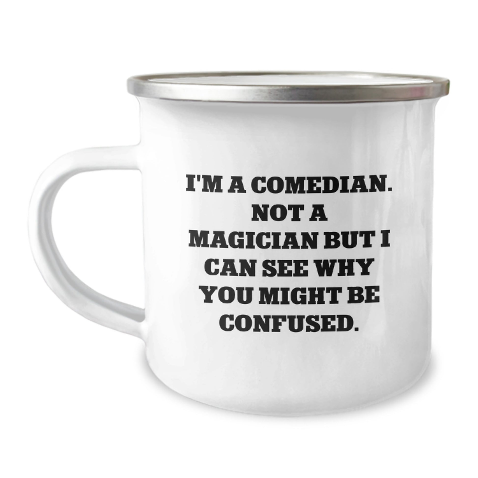 - Esta taza de camping está hecha de acero inoxidable de alta calidad con acabado esmaltado. Es resistente y elegante, perfecta para cualquier ocasión. La frase «Soy comediante. No mago, pero entiendo por qué podrías estar confundido» está impresa de forma permanente y vibrante, lo que garantiza que no se decolore con los lavados. Es el regalo ideal para cualquier amante de la comedia.