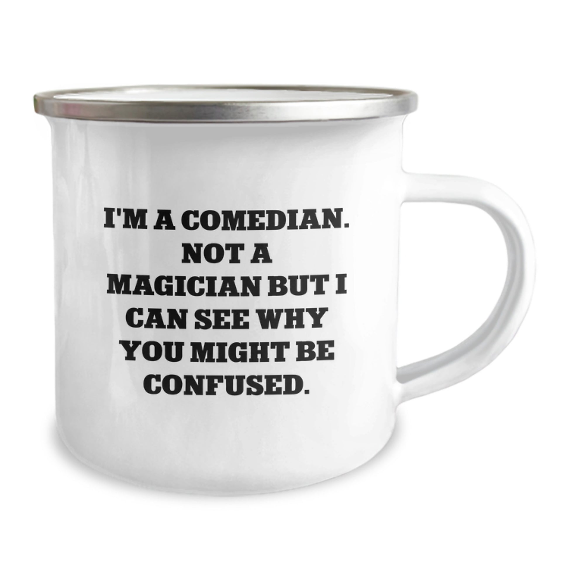- Esta divertida taza de camping con diseño de comediante es el regalo ideal para cualquier amante del humor. Es una forma única y atenta de demostrar tu aprecio por su sentido del humor. La frase «Soy comediante. No mago, pero entiendo por qué podrías estar confundido» seguro les sacará una sonrisa. Fabricada en acero inoxidable de alta calidad con acabado esmaltado, esta taza de camping es resistente y elegante. Es el regalo ideal para cualquier ocasión, especialmente para Navidad.