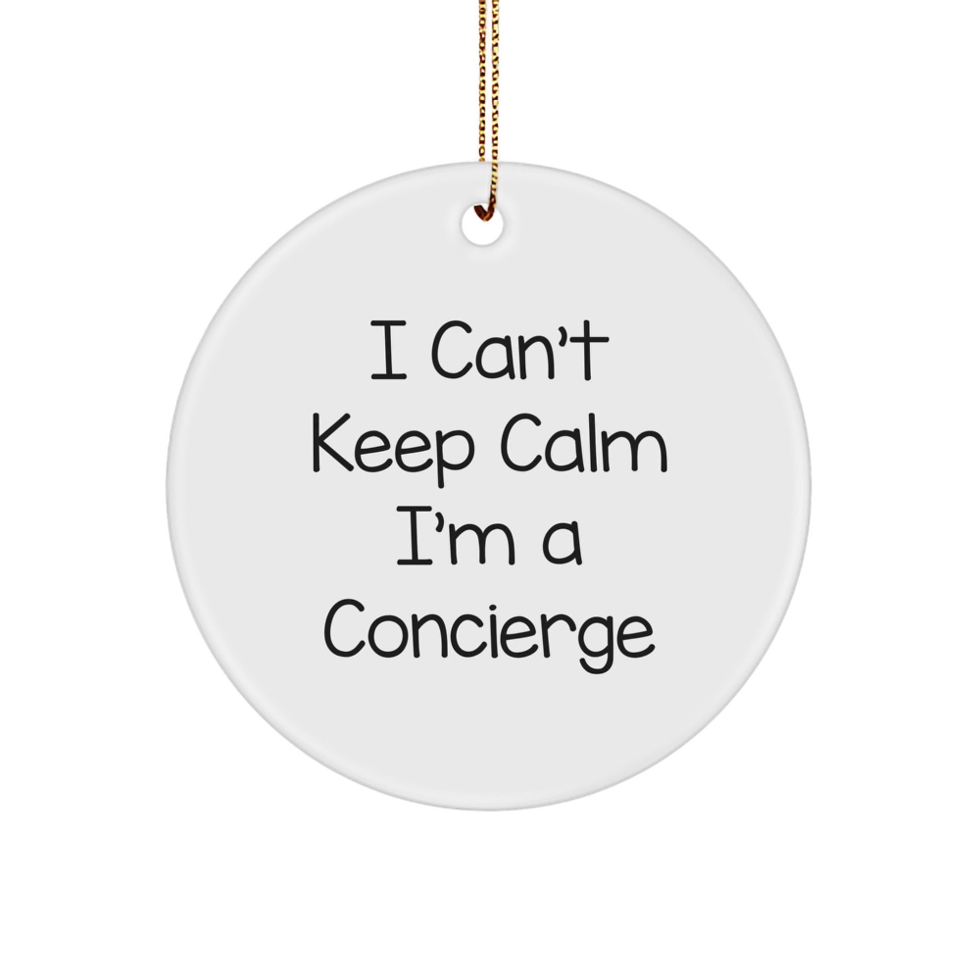 - La frase "No puedo mantener la calma, soy conserje" es una forma divertida y lúdica de demostrar tu amor y aprecio por el conserje en tu vida. Este adorno circular de conserje es un regalo único que añadirá un toque de alegría y personalidad a cualquier habitación. Sus vibrantes colores y su festivo cordón dorado lo convierten en una excelente adición para cualquier hogar u oficina.