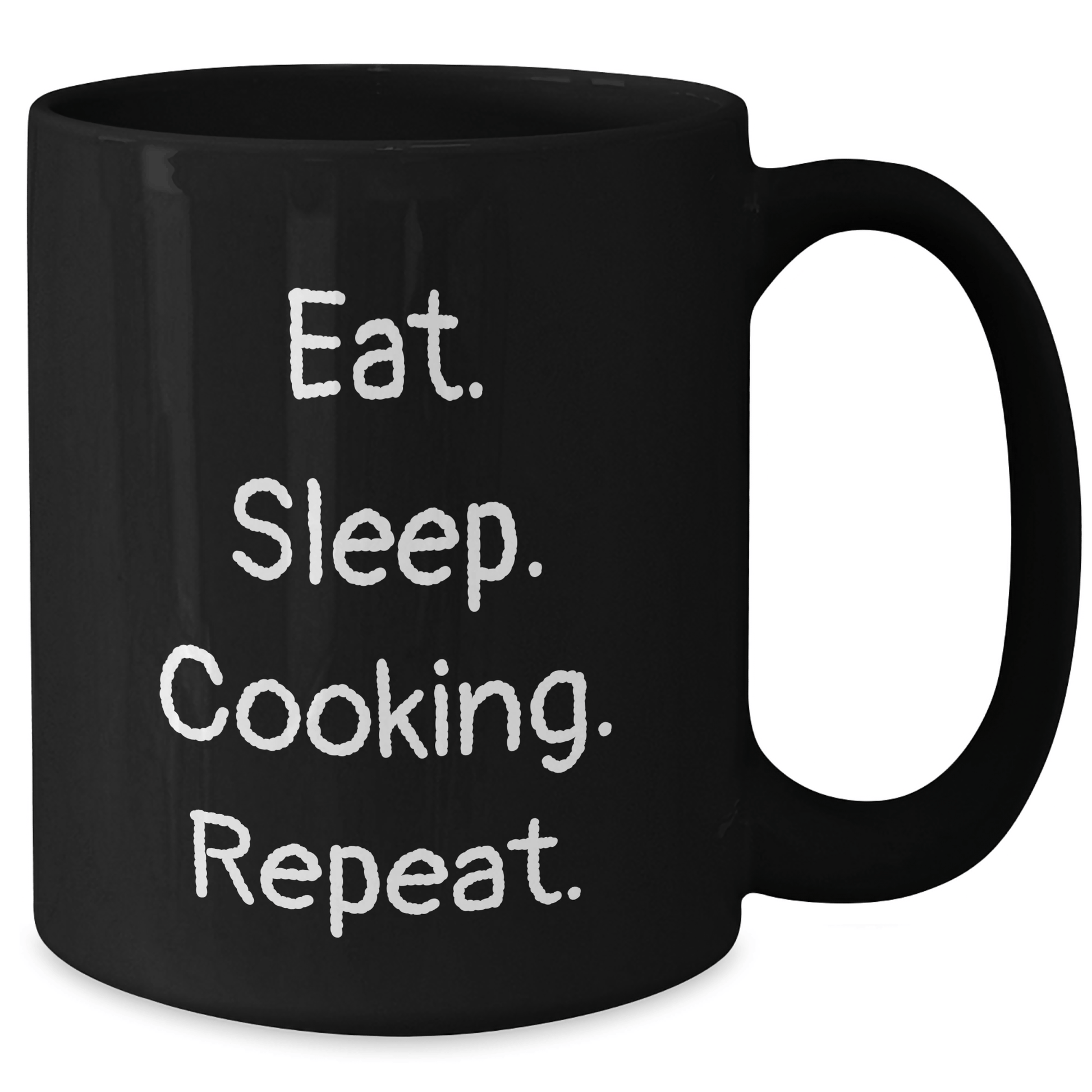 ¿Eres un apasionado de la cocina o conoces a alguien que lo sea? Esta divertida taza de café negro es el regalo ideal para una graduación o cualquier ocasión especial. La frase "Comer. Dormir. Cocinar. Repetir" expresa con humor la pasión por la cocina. La taza de cerámica es apta para microondas y lavavajillas, lo que facilita su uso y limpieza.