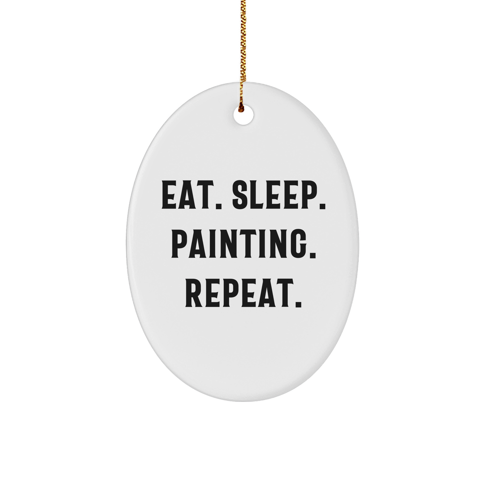 - "Comer. Dormir. Pintar. Repetir." inspira creatividad con este singular adorno ovalado, perfecto para amantes de la pintura y el arte. Presenta un vibrante color blanco y una hermosa forma ovalada. Mide 8,25 cm de alto y 3 mm de grosor. Está fabricado en MDF resistente con un acabado plástico brillante para diseños duraderos y colores vibrantes. Es ligero y resistente a las roturas, ideal para hogares con niños o mascotas.