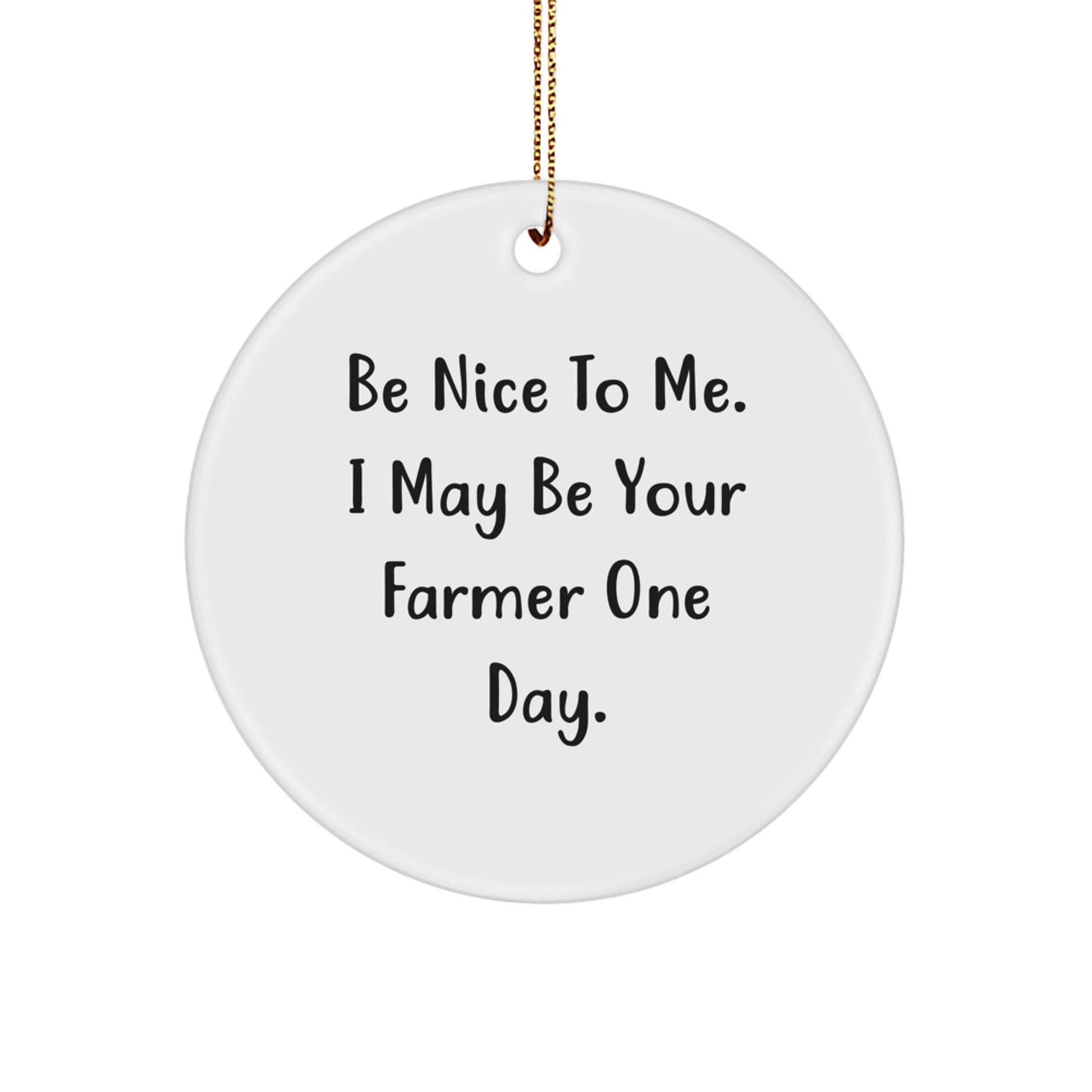 - Saca una sonrisa a tu granjero o entusiasta de la granja favorito con este adorno circular "Sé amable conmigo. Quizás algún día seré tu granjero". Elaborado con esmero para una experiencia decorativa sin estrés. Simplemente cuélgalo del cordón dorado incluido y disfruta de su encanto festivo: un complemento perfecto para tu decoración navideña.