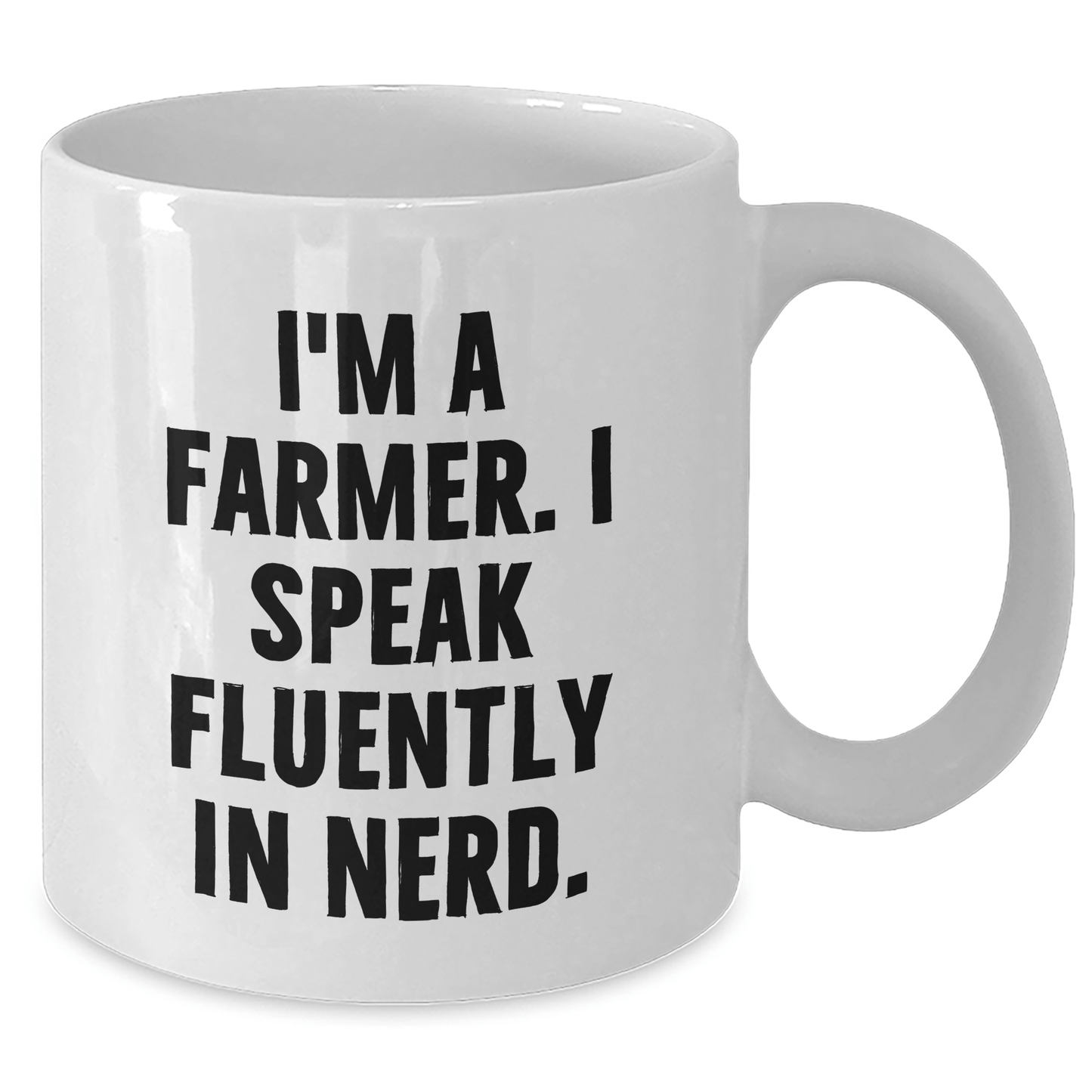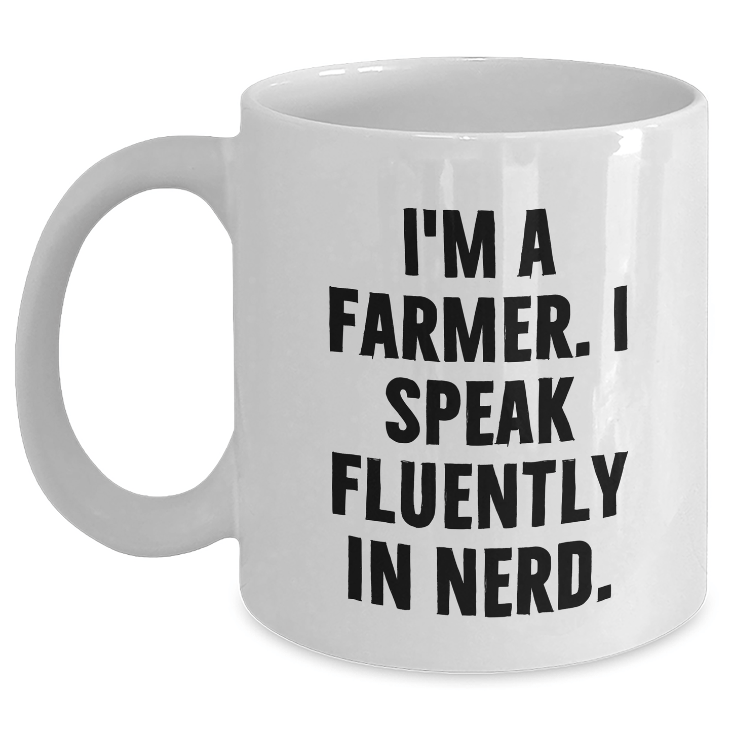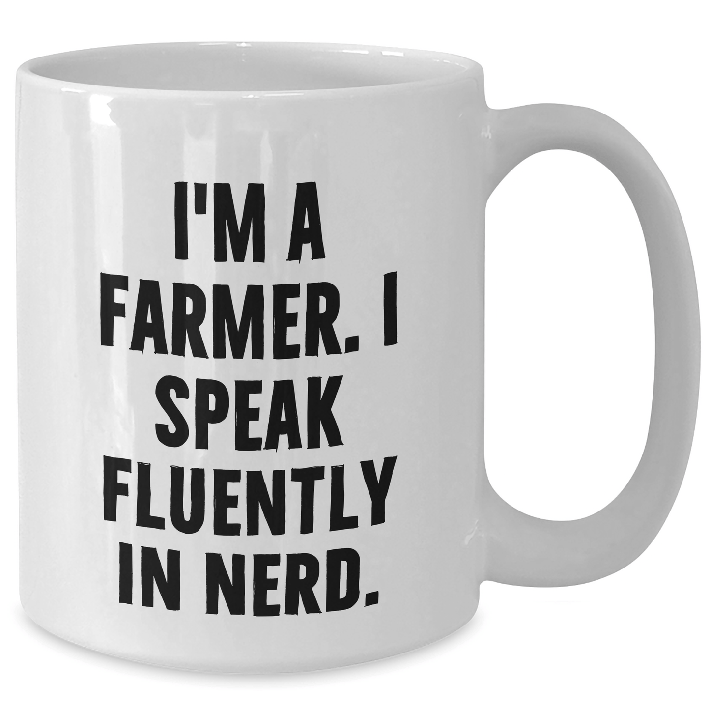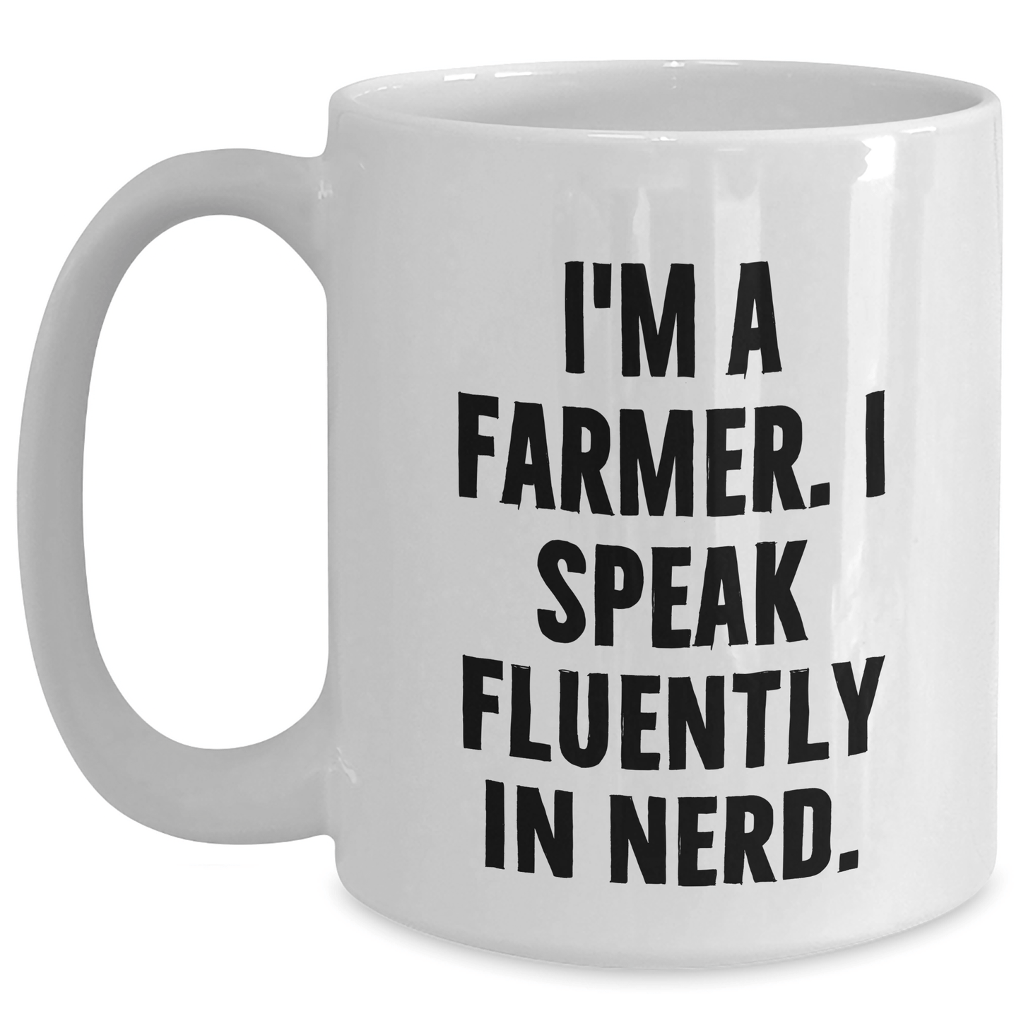 - No te lo pierdas y alegra un poco el día de alguien con estos divertidos regalos de granjero, taza de café blanca, regalos de graduación únicos de amigos a hombres y 'Soy un granjero. Hablo con fluidez en genio.'