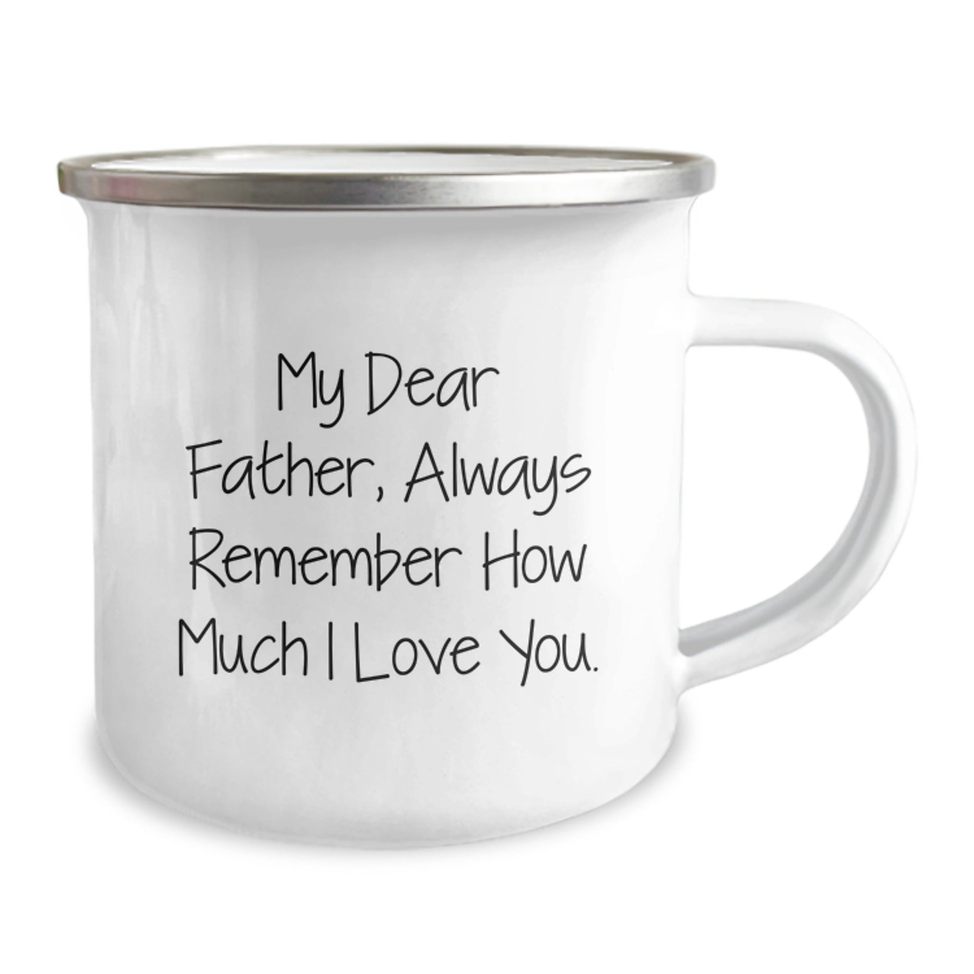 - "Mi querido padre, recuerda siempre cuánto te quiero". ¡Un regalo conmovedor para tu papá especial en su cumpleaños! Esta taza de camping es la manera perfecta de demostrarle a tu padre cuánto lo quieres. Hecha de acero inoxidable resistente con acabado esmaltado, esta taza de 355 ml (12 oz) está diseñada para soportar la intemperie. La impresión permanente es resistente a la decoloración, lo que garantiza que la frase se mantenga vibrante incluso después de varios lavados con detergente suave.