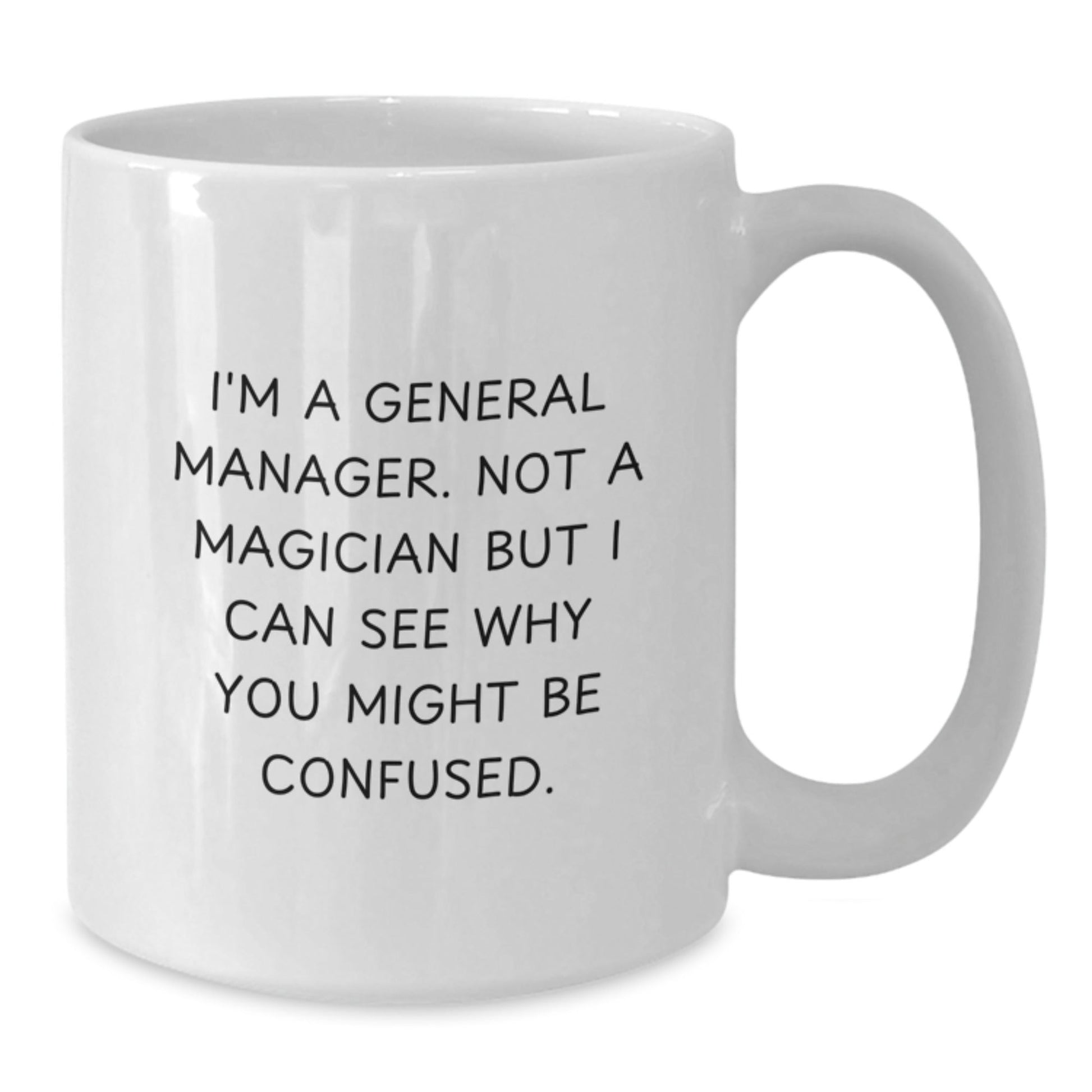 - Dale un toque de estilo a tu día a día con esta taza de café blanca con la frase "Soy Gerente General. No un Mago, pero entiendo por qué podrías estar confundido", perfecta para gerentes generales que buscan una forma única de expresarse y añadir un toque de humor a su rutina matutina. Tiene capacidad de 325 ml o 445 ml.