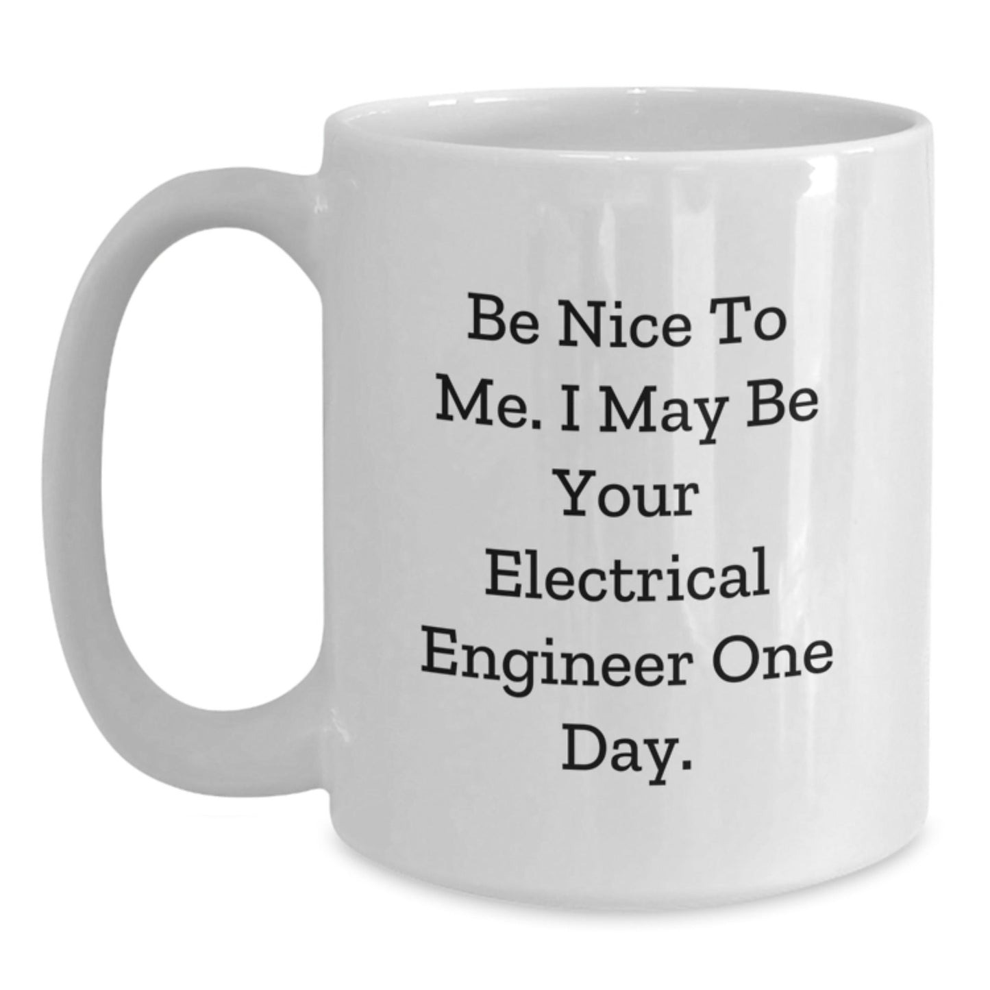 - ¡El regalo perfecto para el aspirante a ingeniero eléctrico de tu vida! Esta frase «Sé amable conmigo. Quizás algún día seré tu ingeniero eléctrico» en nuestra taza de café blanca seguro que le sacará una sonrisa y le inspirará a alcanzar las estrellas.