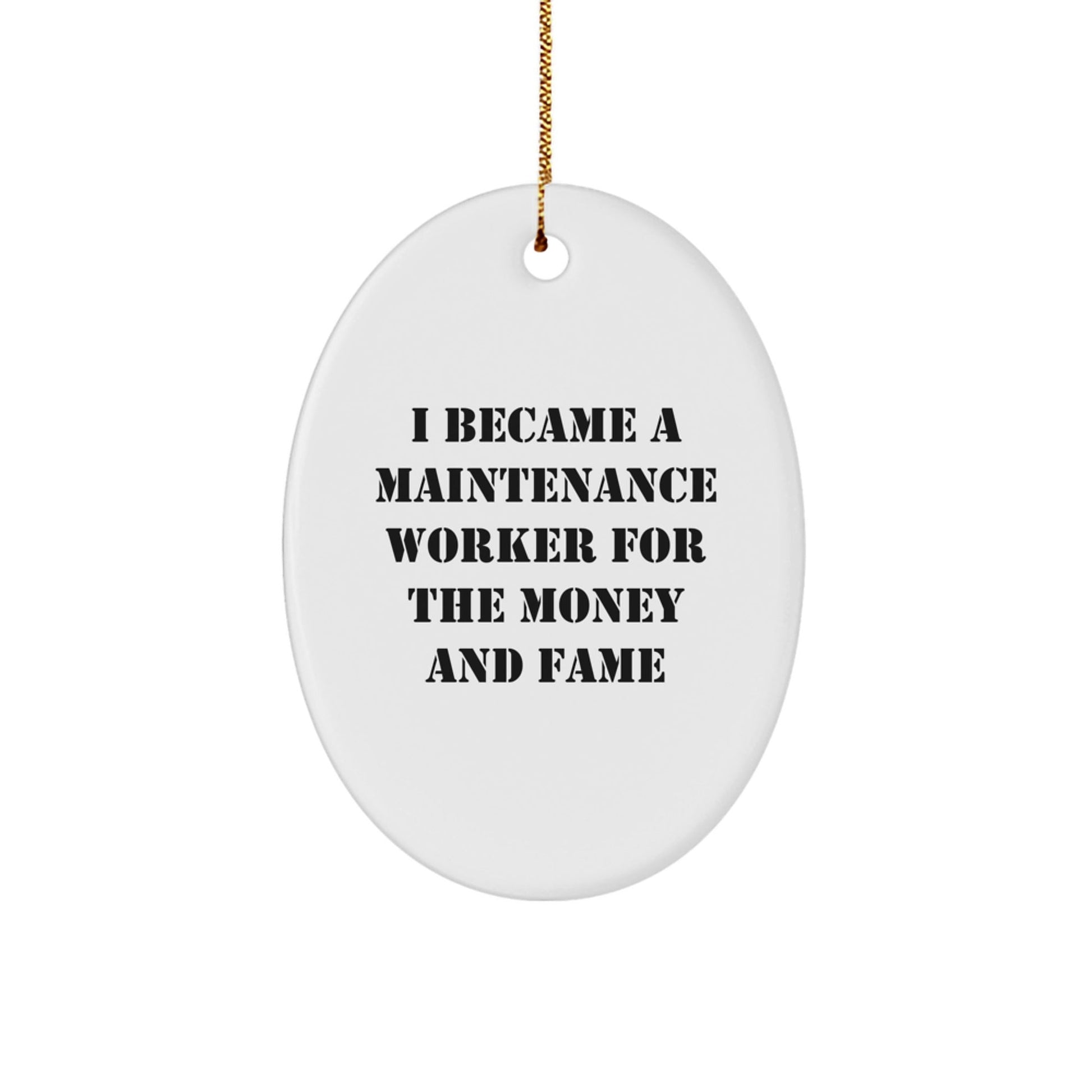 - Este divertido adorno ovalado es un regalo único y considerado para los trabajadores de mantenimiento, y presenta la cita "Me convertí en trabajador de mantenimiento por el dinero y la fama" que seguramente les traerá una sonrisa a su rostro.