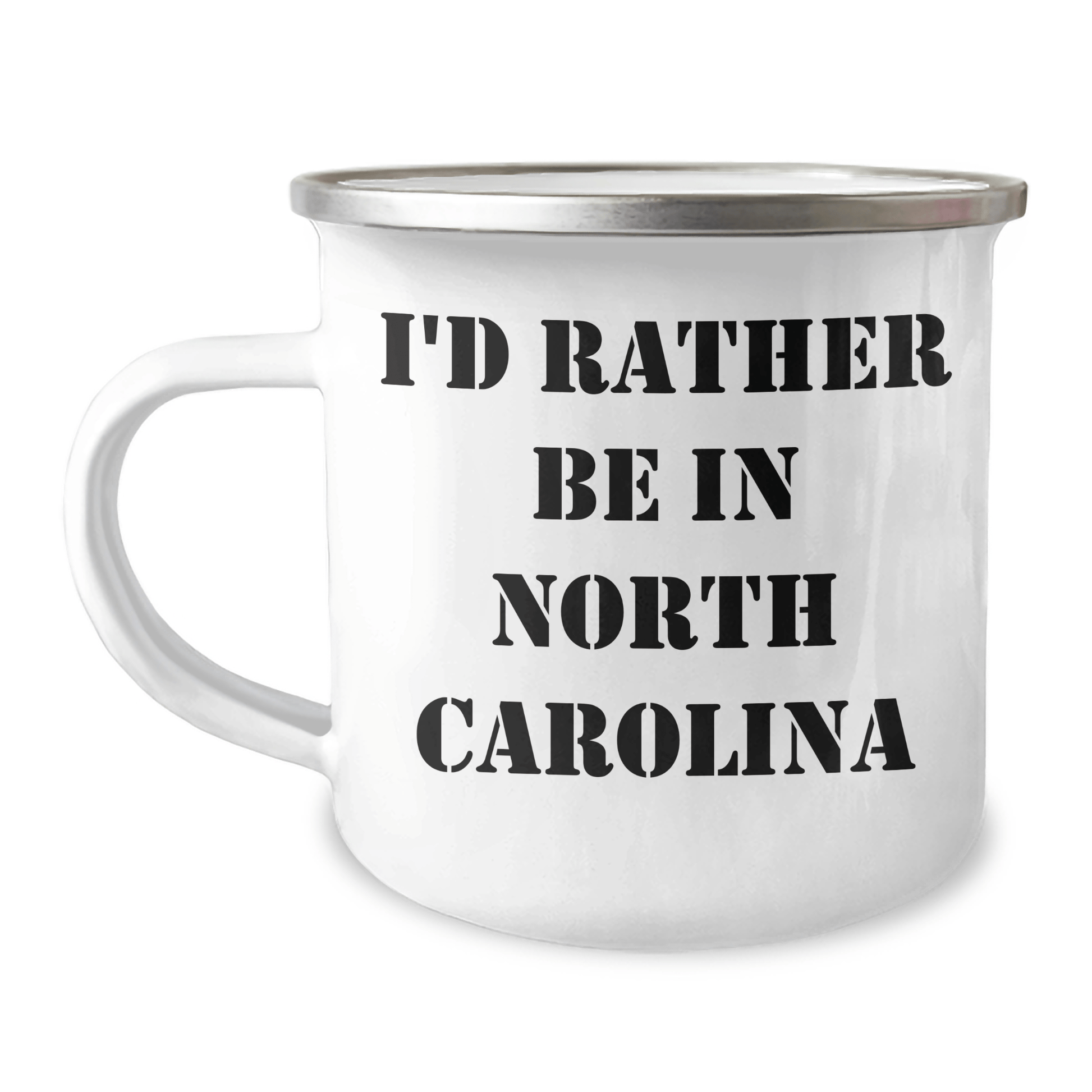 - Esta taza de camping "Prefiero Estar en Carolina del Norte" está hecha de acero inoxidable con acabado esmaltado, lo que garantiza su resistencia y durabilidad. Con una capacidad de 355 ml, es perfecta para bebidas frías o calientes.