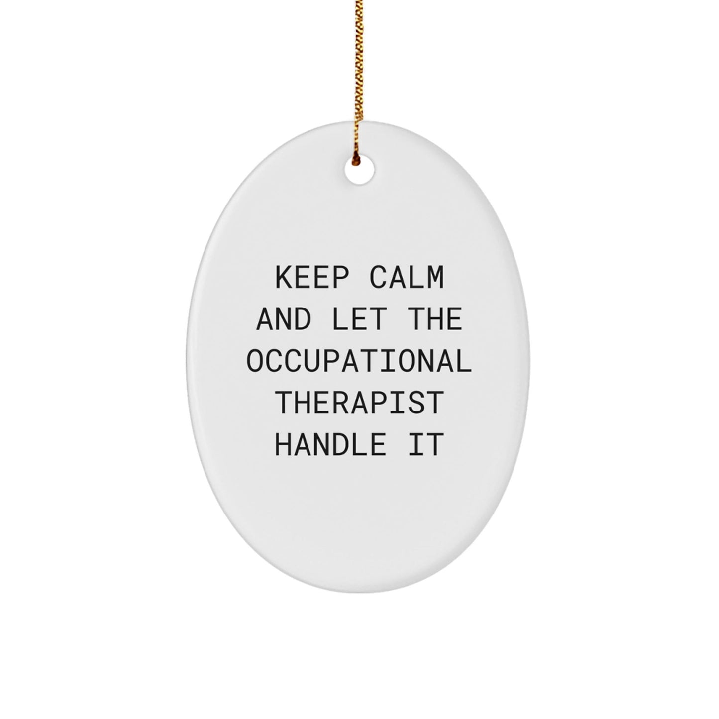 - Este exclusivo adorno ovalado es un regalo divertido para los terapeutas ocupacionales, con una cita divertida que les hará sonreír: "Mantenga la calma y deje que el terapeuta ocupacional se encargue".