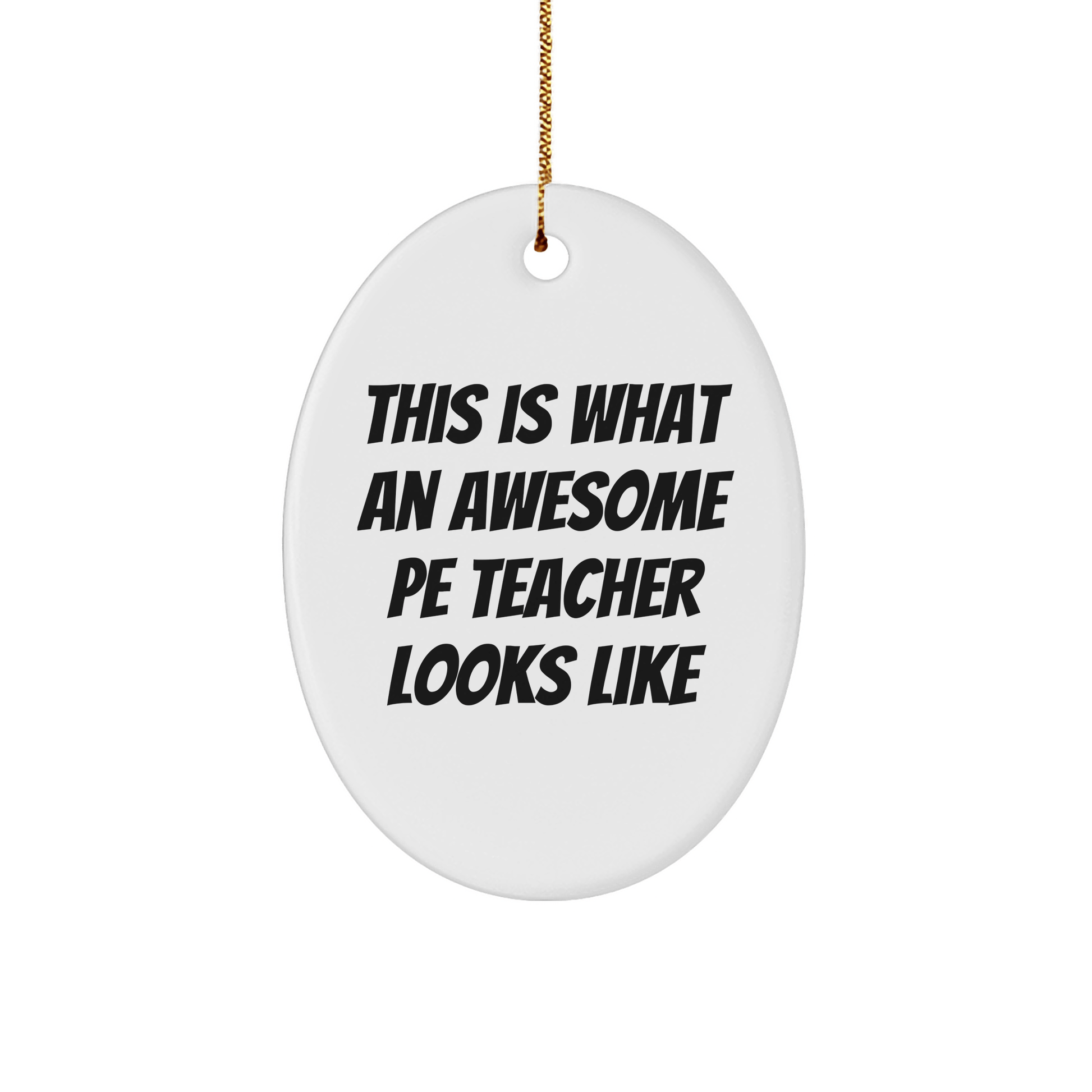 - Deje una impresión duradera en su profesor de educación física con este adorno ovalado que dice "Así es como luce un profesor de educación física increíble", elaborado por expertos para conmemorar su dedicación y entusiasmo por formar mentes jóvenes.
