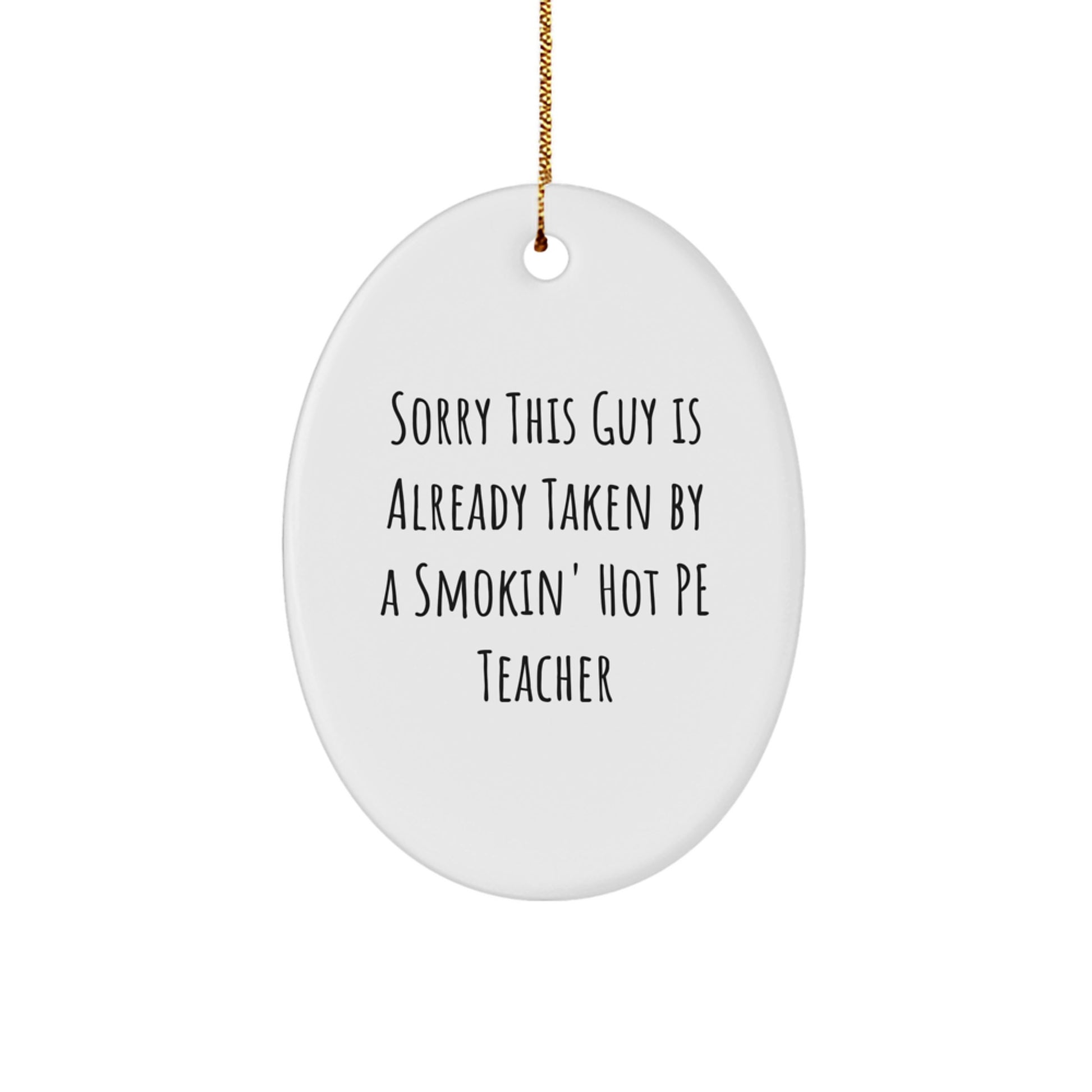 - Este divertido adorno ovalado de profesor de educación física es un regalo único y especial para esa persona especial en tu vida. La frase "Lo siento, este chico ya está ocupado" sin duda le sacará una sonrisa y le hará sentir especial.