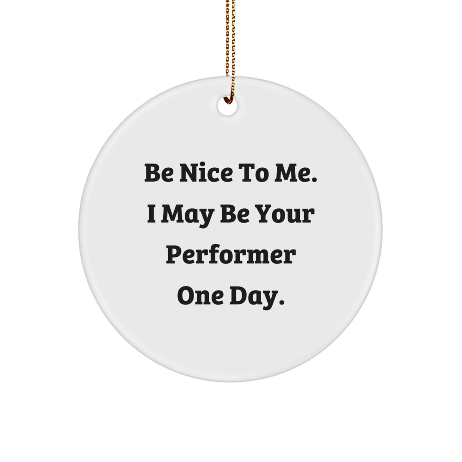 - Añade un toque de humor a tu decoración navideña con este divertido adorno circular que incluye la frase "Sé amable conmigo. Puede que algún día sea tu artista".
