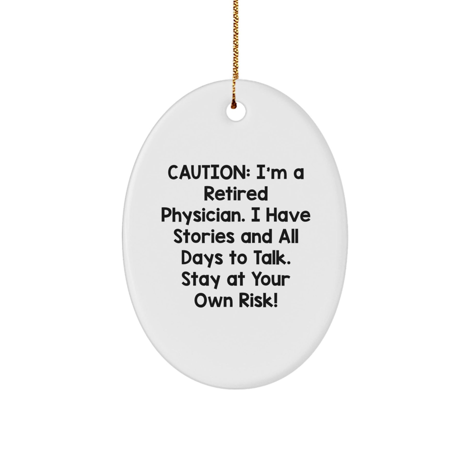 - Pida hoy mismo este adorno ovalado «Precaución: Soy médico jubilado. Tengo historias y todo el día para contar. ¡Actúa bajo tu propio riesgo!» y demuestre su agradecimiento por el trabajo duro y la dedicación de un médico. Es un regalo único y considerado que atesorará durante años.