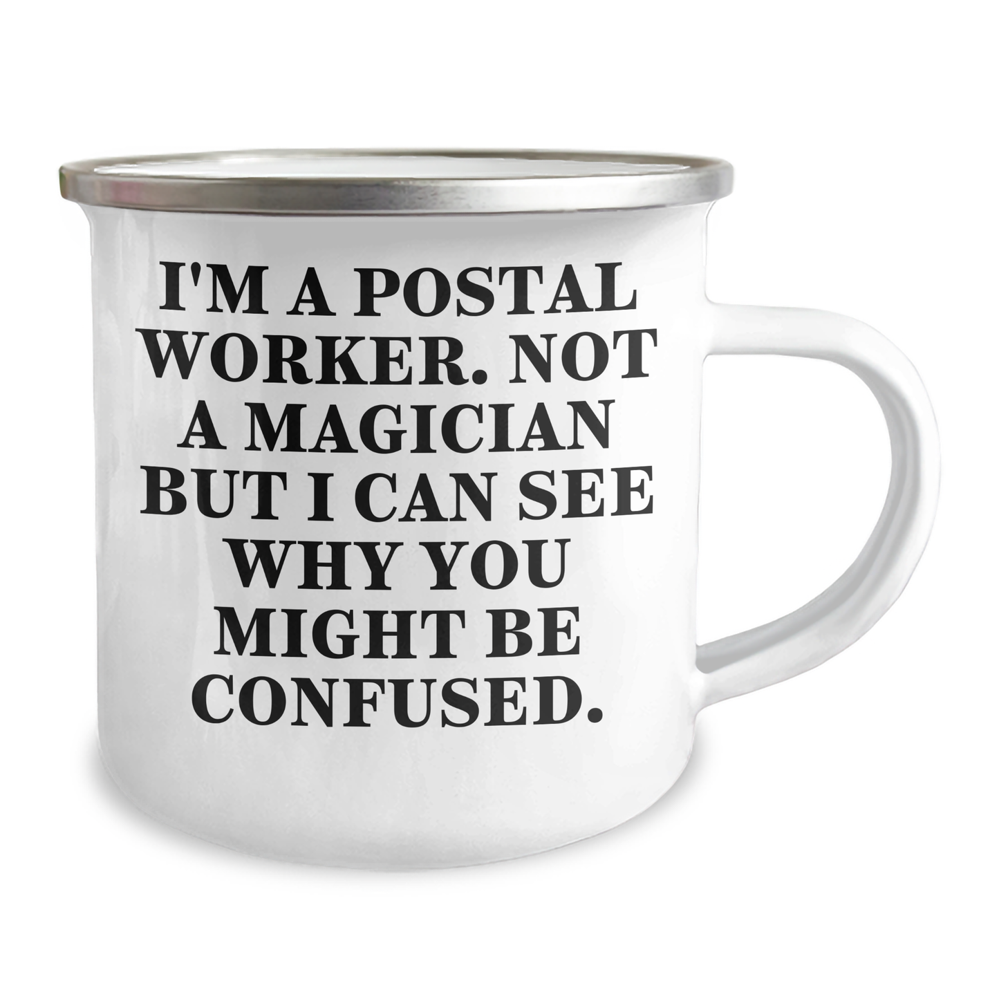 - Esta taza de camping es la manera perfecta de demostrar tu aprecio por el cartero de tu vida, con su divertida frase: «Soy cartero. No mago, pero entiendo por qué podrías estar confundido».