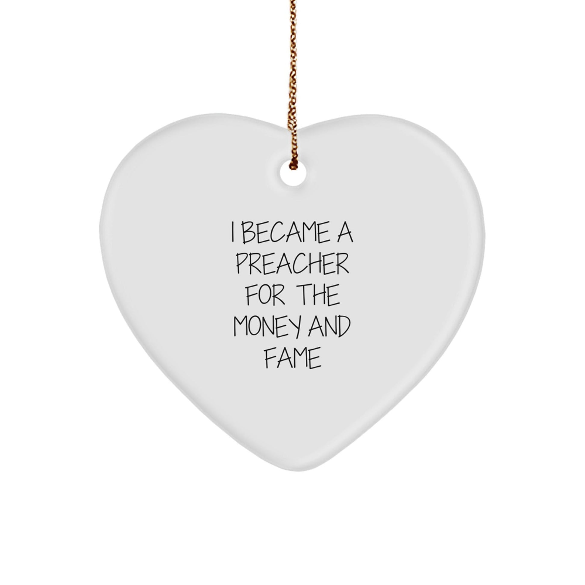 ¿Buscas un regalo único para el predicador de tu vida? ¡No busques más! Este divertido adorno de corazón es el complemento perfecto para cualquier decoración navideña. La frase "Me convertí en predicador por el dinero y la fama" sin duda le sacará una sonrisa. Un regalo ideal para amigos, familiares o compañeros de trabajo que aprecian las risas. El resistente material de MDF y el acabado brillante garantizan que este adorno durará muchos años. El vibrante proceso de impresión le da vida al diseño, haciéndolo destacar en cualquier árbol o repisa. Regala risas y alegría estas fiestas con este exclusivo adorno de corazón de predicador.