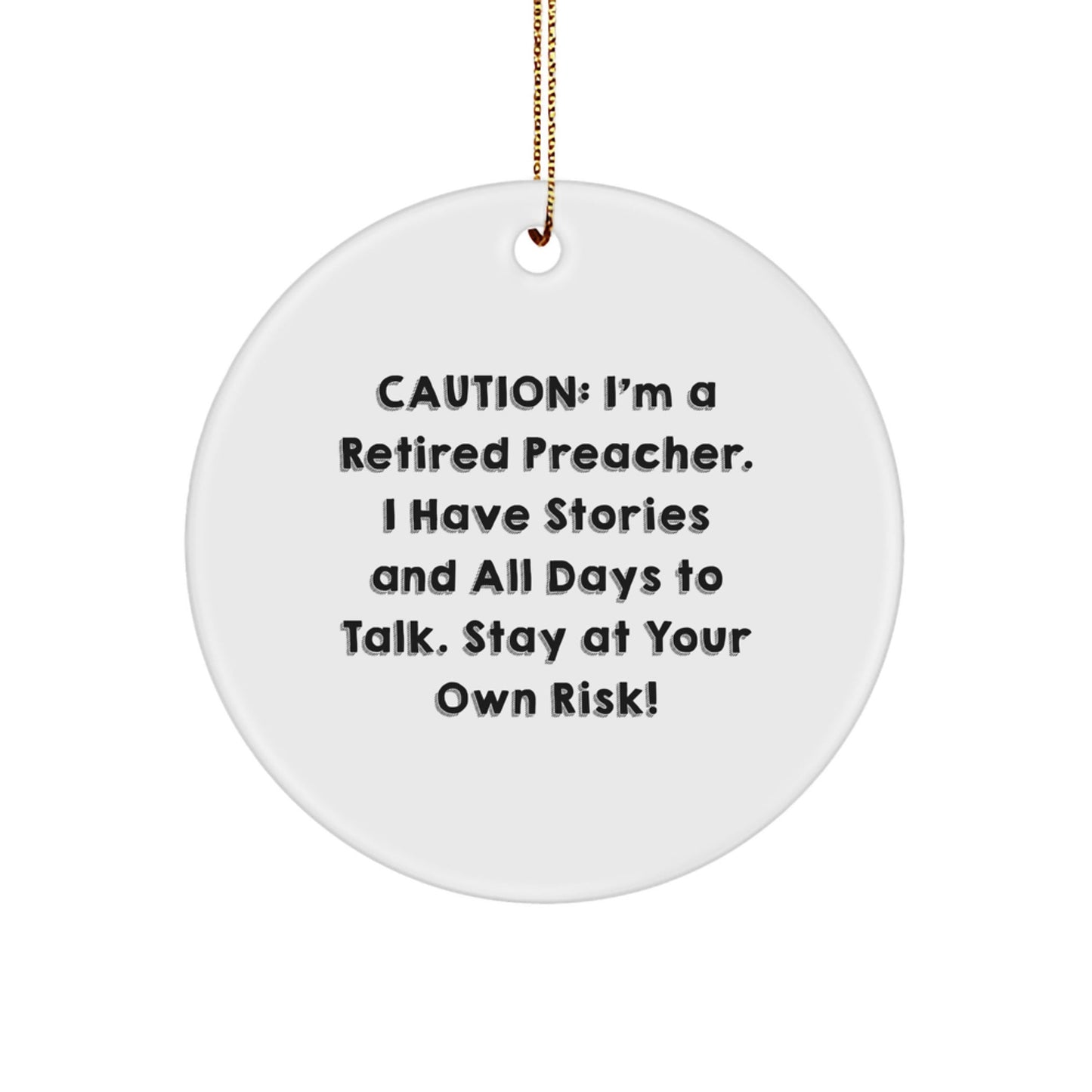 Como predicador jubilado, sabes que la frase «Precaución: Soy un predicador jubilado. Tengo historias y todo el día para contar. ¡Asume tu responsabilidad!» es una forma divertida de burlarse del estereotipo de que los predicadores siempre hablan. Este adorno circular es una forma divertida de compartir ese humor con amigos y familiares.
