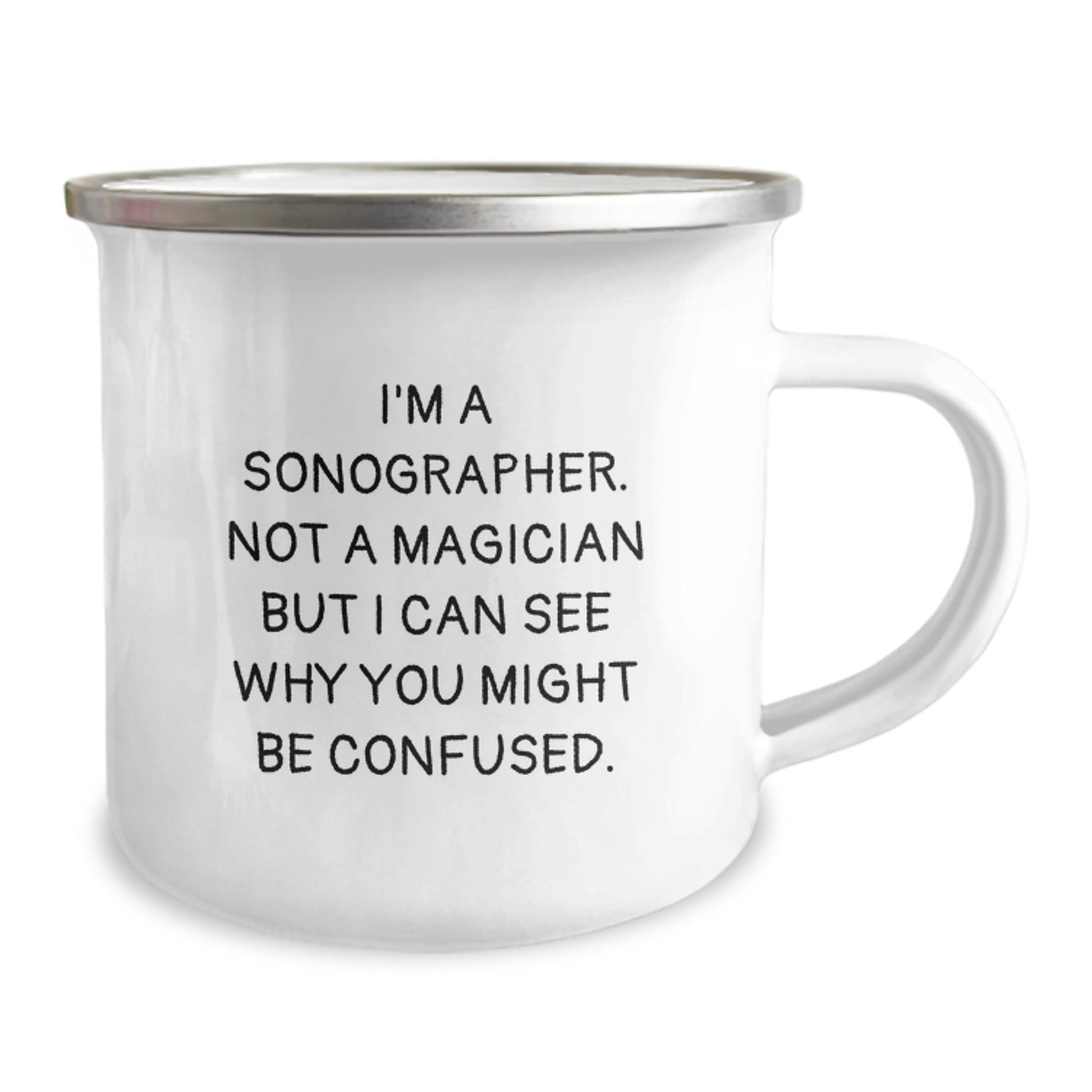 ¿Buscas un regalo original para tu ecografista? ¡No busques más! Esta divertida taza de camping es la manera perfecta de demostrar tu agradecimiento por su trabajo y dedicación. La frase «Soy ecografista. No mago, pero entiendo por qué podrías estar confundido» es una excelente manera de burlarse de la a menudo malinterpretada profesión de la ecografía.