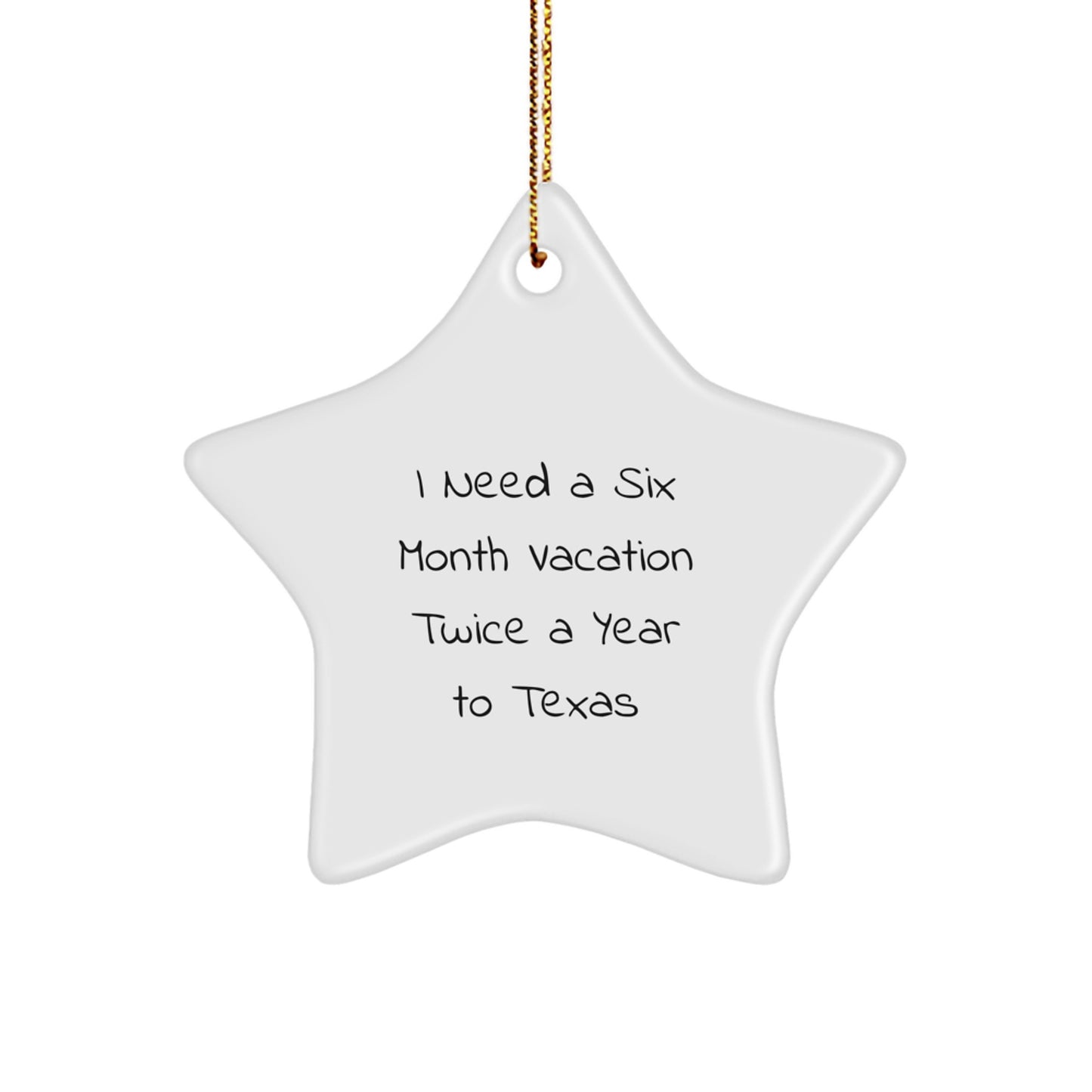 ¿Cansado de vivir en el mismo sitio? ¿Necesitas un respiro de la rutina diaria? ¡Este divertido adorno de estrella de Texas es el regalo ideal para amigos y familiares amantes del Estado de la Estrella Solitaria! Con su vibrante color blanco y diseño en forma de estrella, sin duda alegrará cualquier habitación. La inspiradora frase "Necesito unas vacaciones de seis meses dos veces al año en Texas" es una cita divertida y reconocible que le sacará una sonrisa a cualquiera. Ya sea que busques un regalo original para un compañero de trabajo, un amigo o un familiar, este adorno de estrella de Texas es la elección perfecta. Es una excelente manera de demostrar tu amor y aprecio por Texas y su belleza. ¿A qué esperas? ¡Regala risas y relajación con este divertido adorno de estrella de Texas!