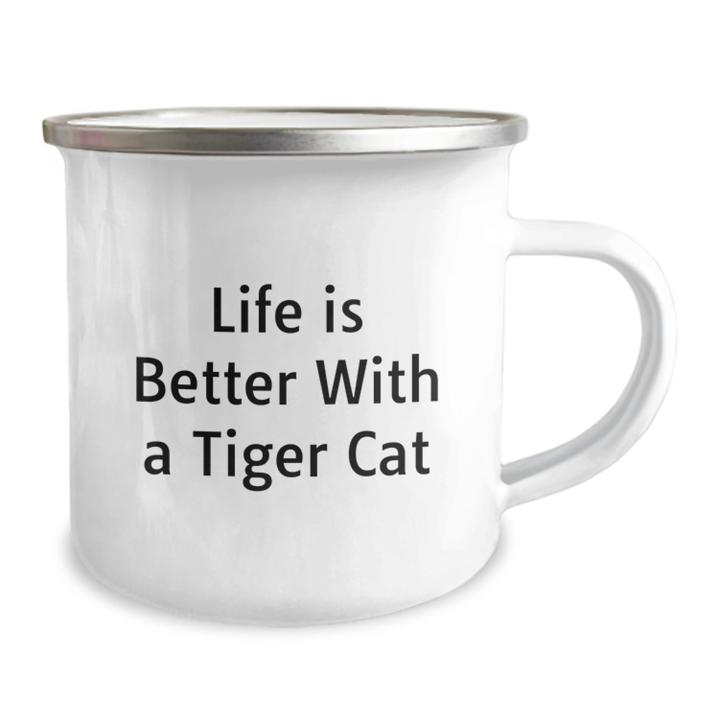 - Diseño único de taza de camping con una divertida cita de Tiger Cat, "La vida es mejor con un Tiger Cat", que seguramente traerá una sonrisa al rostro de cualquier destinatario.