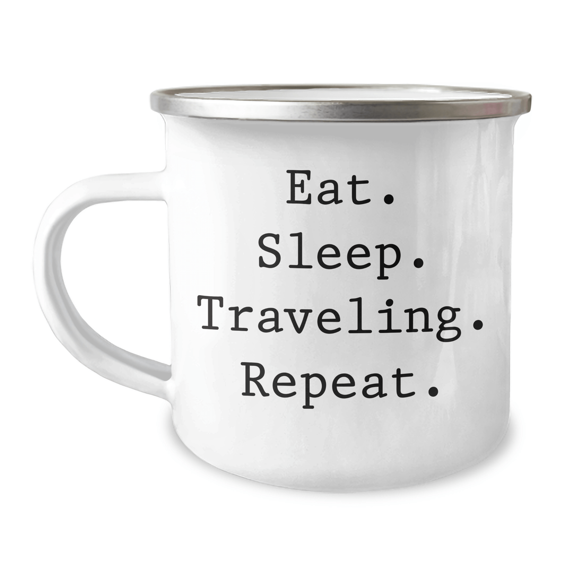 ¿Listo para alimentar la pasión viajera de tus amigos o familiares? ¡No busques más! Esta divertida taza "Comer. Dormir. Viajar. Repetir. Acampar" es el regalo ideal para cualquier amante de los viajes. Hecha de resistente acero inoxidable con acabado esmaltado, esta taza está diseñada para soportar los rigores de la aventura. Ya sea que envíes un regalo a tus amigos, familiares o compañeros de trabajo, esta taza les sacará una sonrisa.