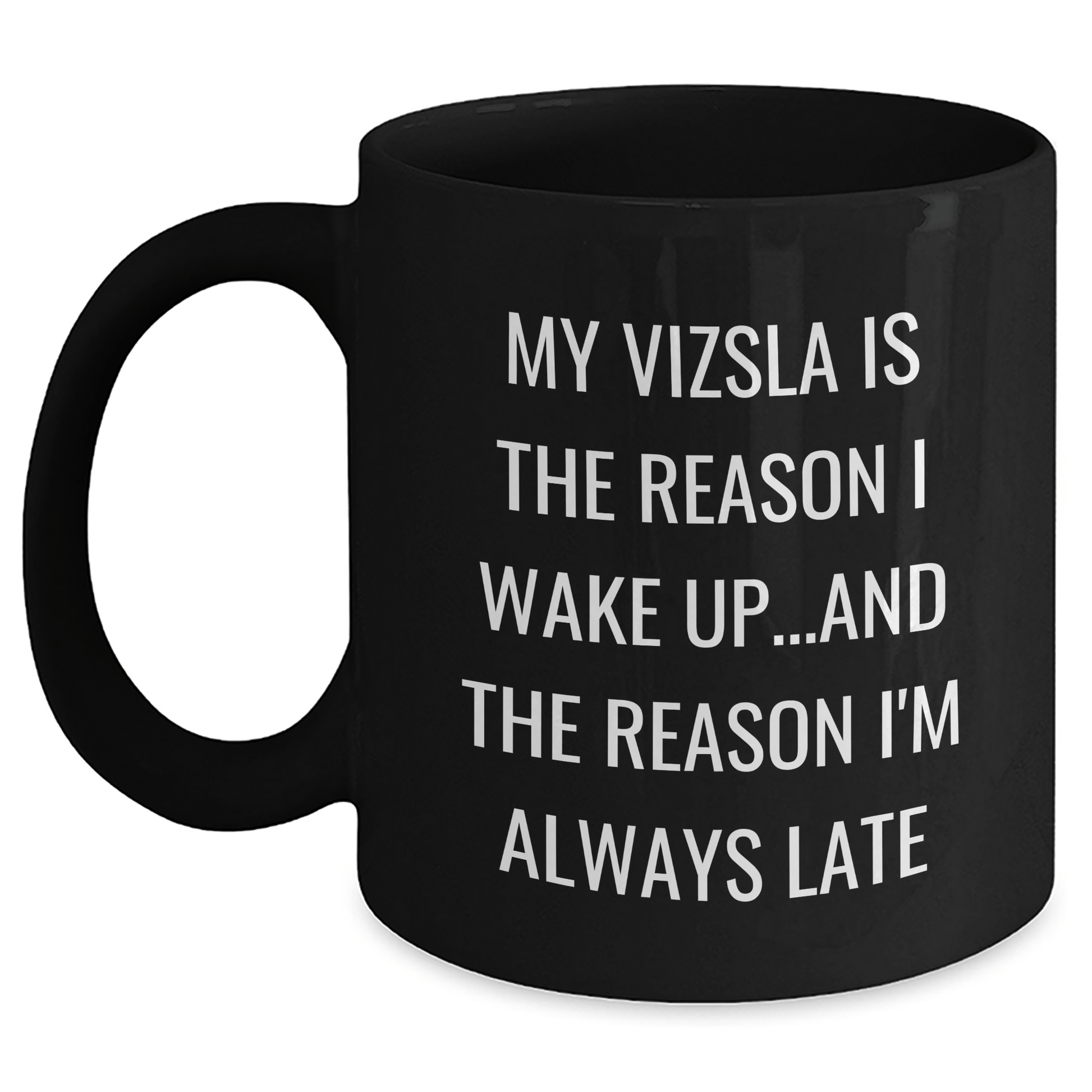 ¿Eres un entusiasta de los Vizsla o buscas un regalo único para quien te importa? ¡No busques más! Esta taza de café negra tiene una frase conmovedora que llega al alma de cualquier amante de los Vizsla: «Mi Vizsla es la razón por la que me despierto... y la razón por la que siempre llego tarde».