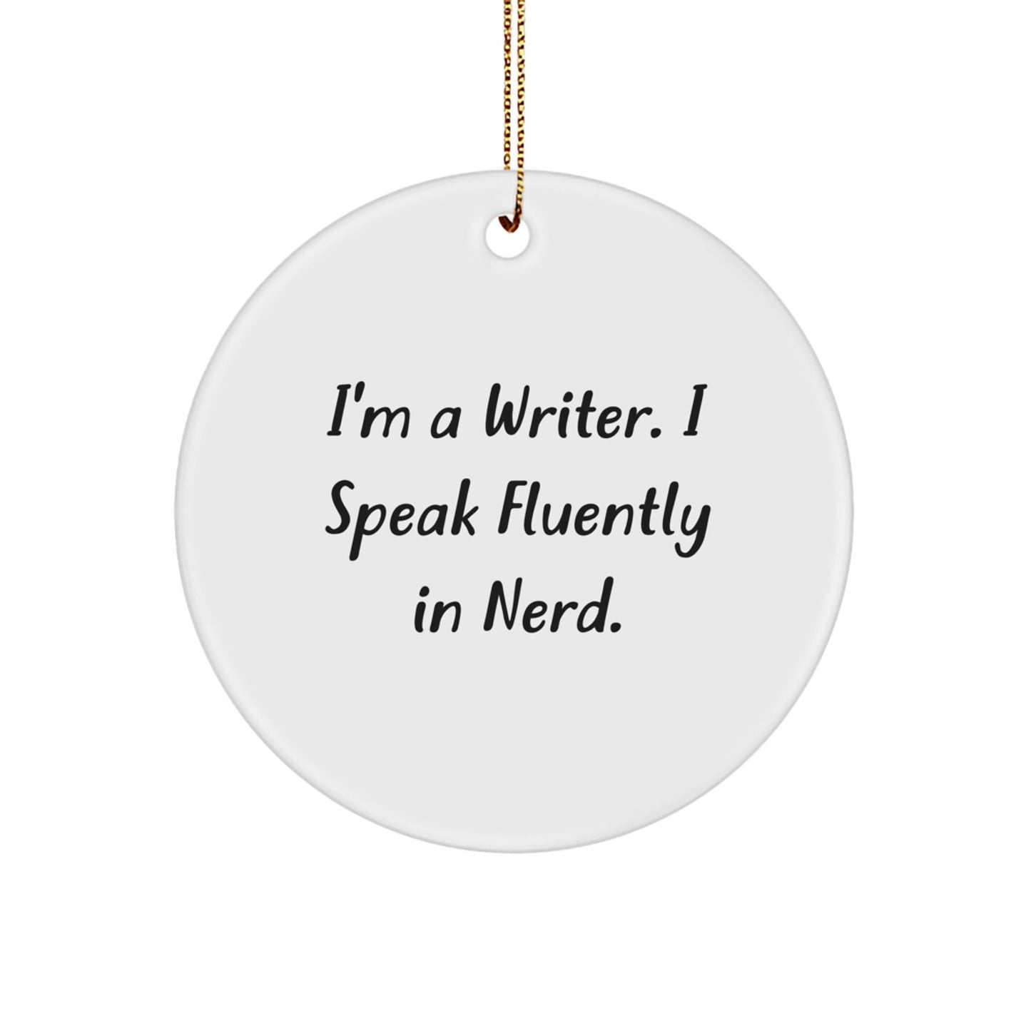 - "Soy escritor. Hablo con fluidez el idioma nerd". Cita grabada en un hermoso adorno circular: el regalo perfecto para el escritor de tu vida, ideal para decorar tu escritorio o como un detalle para tus compañeros escritores. Prepárate para realzar tu espacio de escritura con este impresionante y vibrante adorno circular blanco que irradia creatividad e inspiración.
