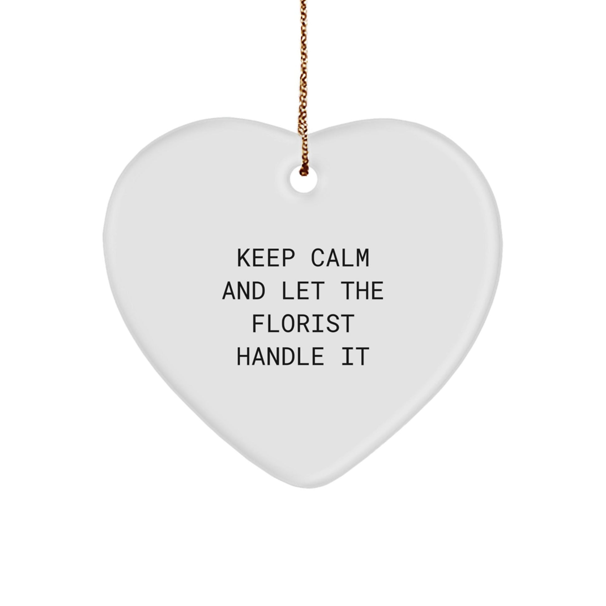 - Este hermoso adorno de corazón es un regalo único y considerado para cualquier florista, con la divertida y fácil de identificar cita "Mantenga la calma y deje que el florista se encargue".