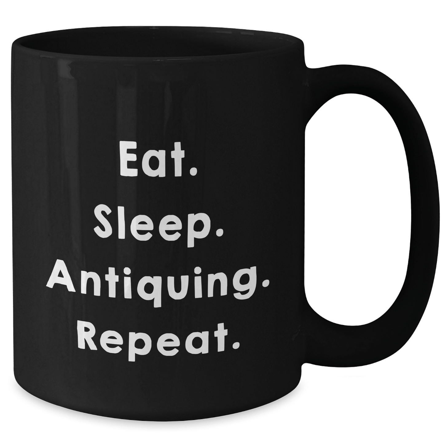 - Nuestra taza de café negra "Comer. Dormir. Antigüedades. Repetir. Es una excelente manera de mostrar tu personalidad e intereses, convirtiéndola en un regalo único y considerado para cualquier ocasión.