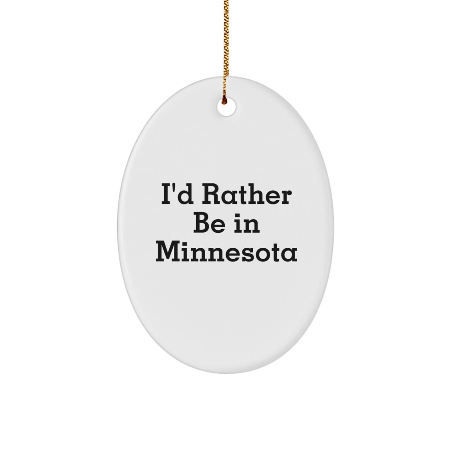 - Este adorno ovalado "Preferiría estar en Minnesota" es una excelente manera de demostrar tu aprecio por tus amigos y familiares. Ya sea para un hombre, una mujer o un niño, este adorno seguro les alegrará el día.