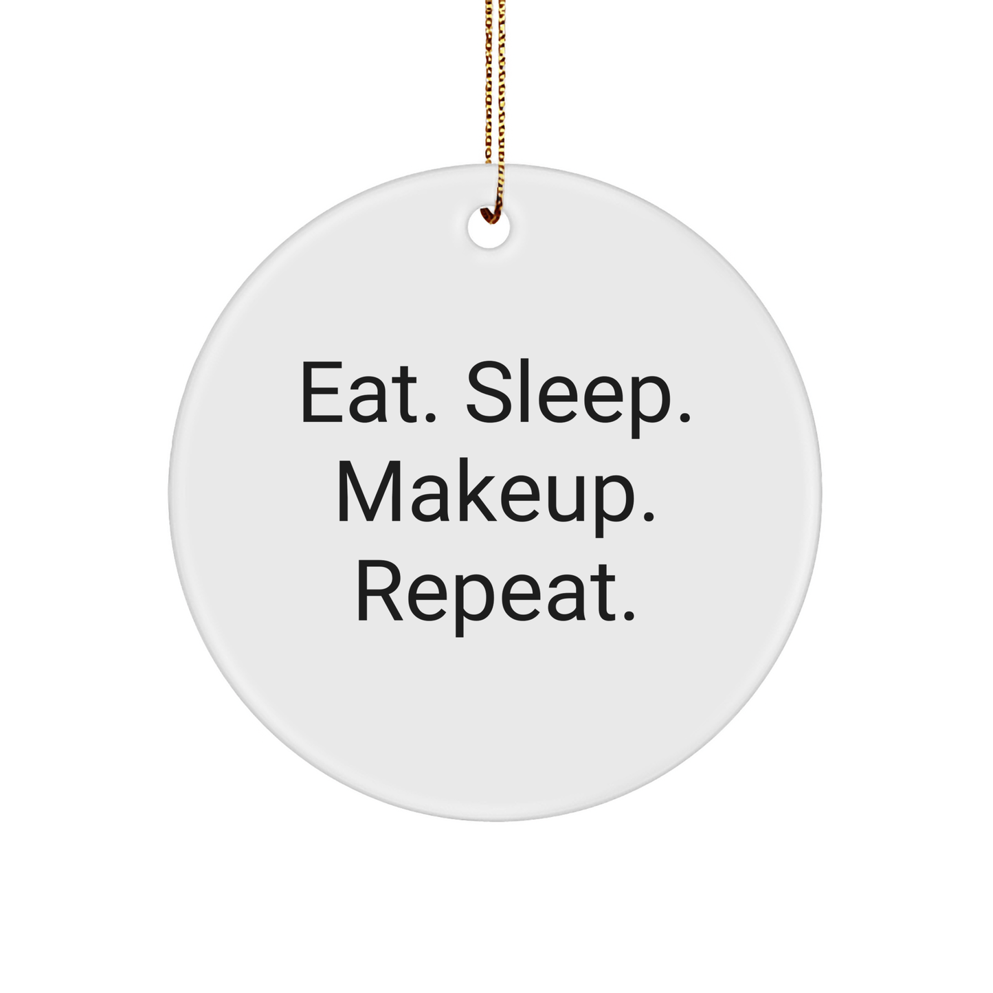 - Este divertido adorno circular es el regalo ideal para los amantes del maquillaje, con la frase "Come. Duerme. Maquíllate. Repite".