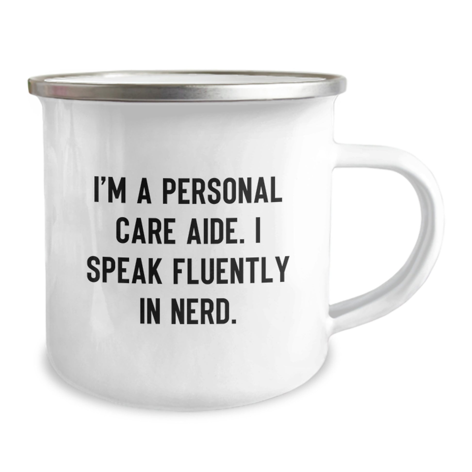 ¿Eres fan de los asistentes de cuidado personal? ¿Conoces a alguien que lo sea? ¡No busques más! Esta divertida taza de camping es el regalo ideal para cualquier asistente de cuidado personal en su cumpleaños. Como asistente de cuidado personal, hablo con fluidez el idioma nerd, y sé que esta taza le sacará una sonrisa. La frase "Soy asistente de cuidado personal. Hablo con fluidez el idioma genio" es una excelente forma de iniciar una conversación y demostrará su peculiar sentido del humor.