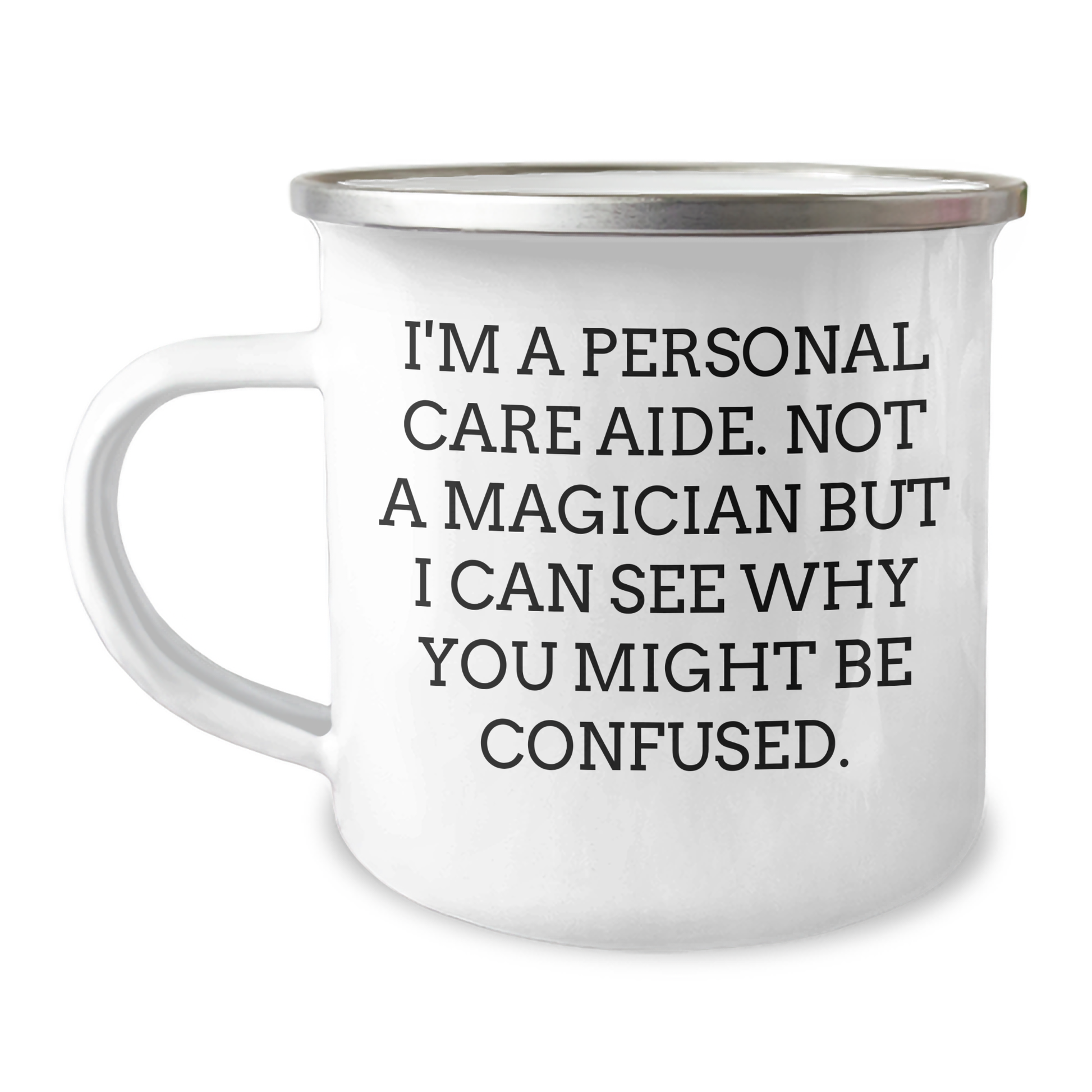 ¿Buscas un regalo único para tu asistente de cuidado personal? ¡No busques más! Esta divertida taza de camping con cita es perfecta para cualquier asistente de cuidado personal que disfrute de una buena risa. Con su ingeniosa frase "No soy mago, pero entiendo por qué podrías estar confundido", esta taza seguro le sacará una sonrisa. Hecha de acero inoxidable de alta calidad con acabado esmaltado, esta taza es resistente y fácil de limpiar. Y con su capacidad de 355 ml, es perfecta para disfrutar de un café o té caliente en una mañana fría. ¿A qué esperas? Envía este considerado regalo a tu asistente de cuidado personal y alegra su día. Ya sea el Día del Padre o un simple gesto de amabilidad, esta taza seguro que será un éxito. Así que adelante, regala a esa persona especial algo que le encantará. Y quién sabe, quizá la use para prepararse un café y empezar el día con buen pie.