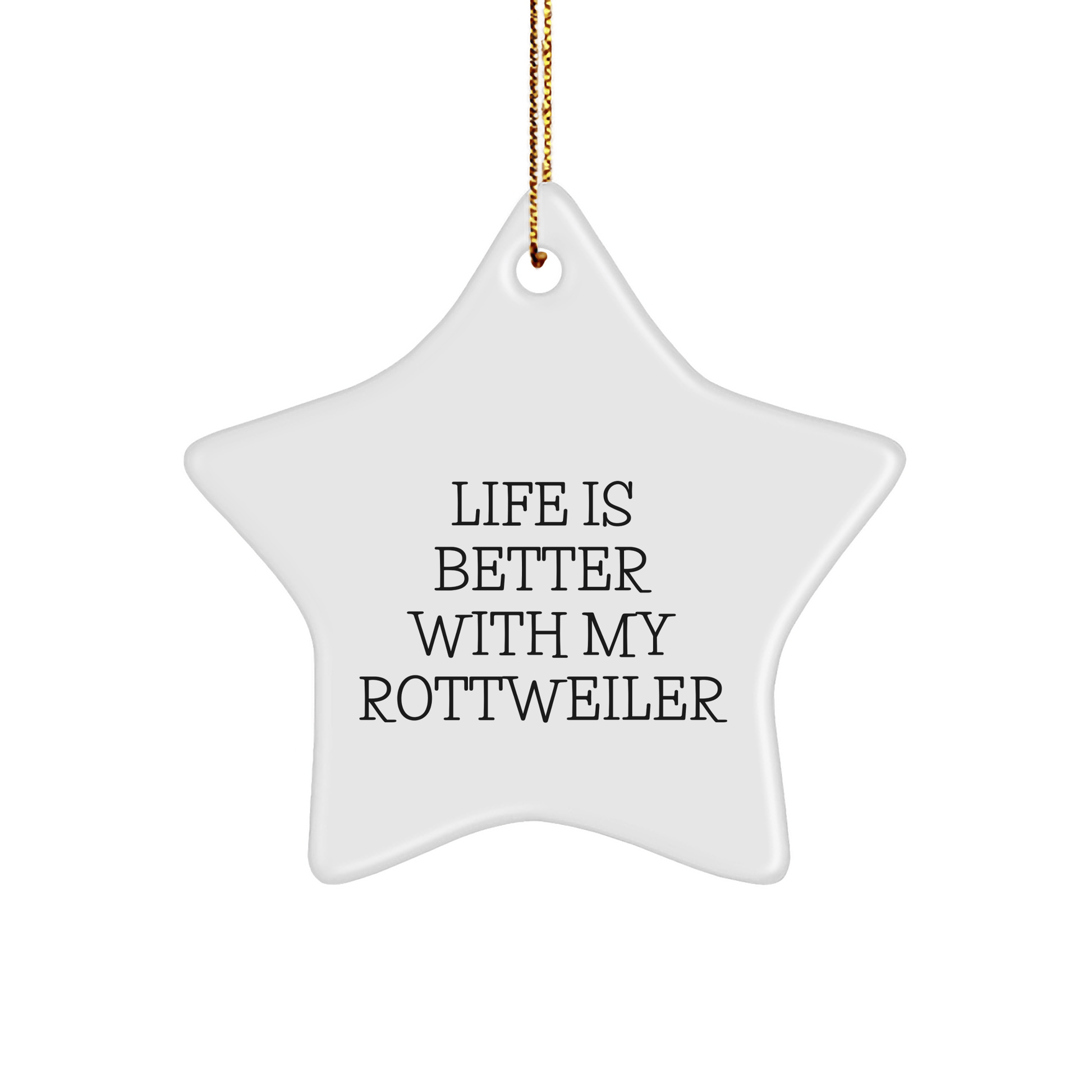 - La cita "La vida es mejor con mi Rottweiler" agrega un toque personal a este adorno de estrella de perro Rottweiler, convirtiéndolo en un recuerdo especial para los años venideros.