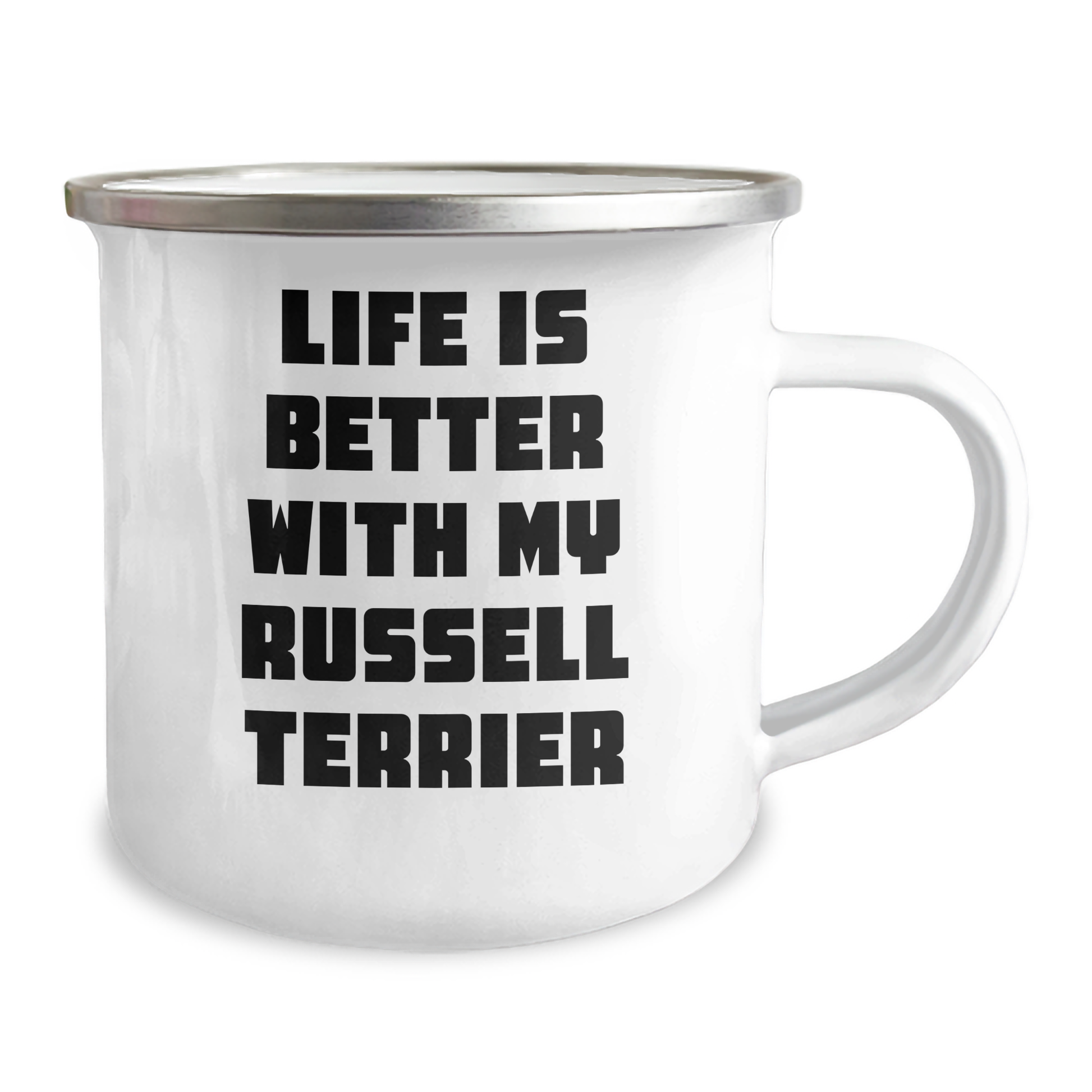 Esta divertida taza de camping no solo es una forma divertida de disfrutar de tu café o té matutino, sino también una excelente manera de expresar tu amor por tu Russell Terrier. La frase "La vida es mejor con mi Russell Terrier" es un gran recordatorio de la alegría y la compañía que nuestras mascotas nos brindan. ¿Por qué no te regalas hoy mismo o a un ser querido este detalle tan considerado y divertido?