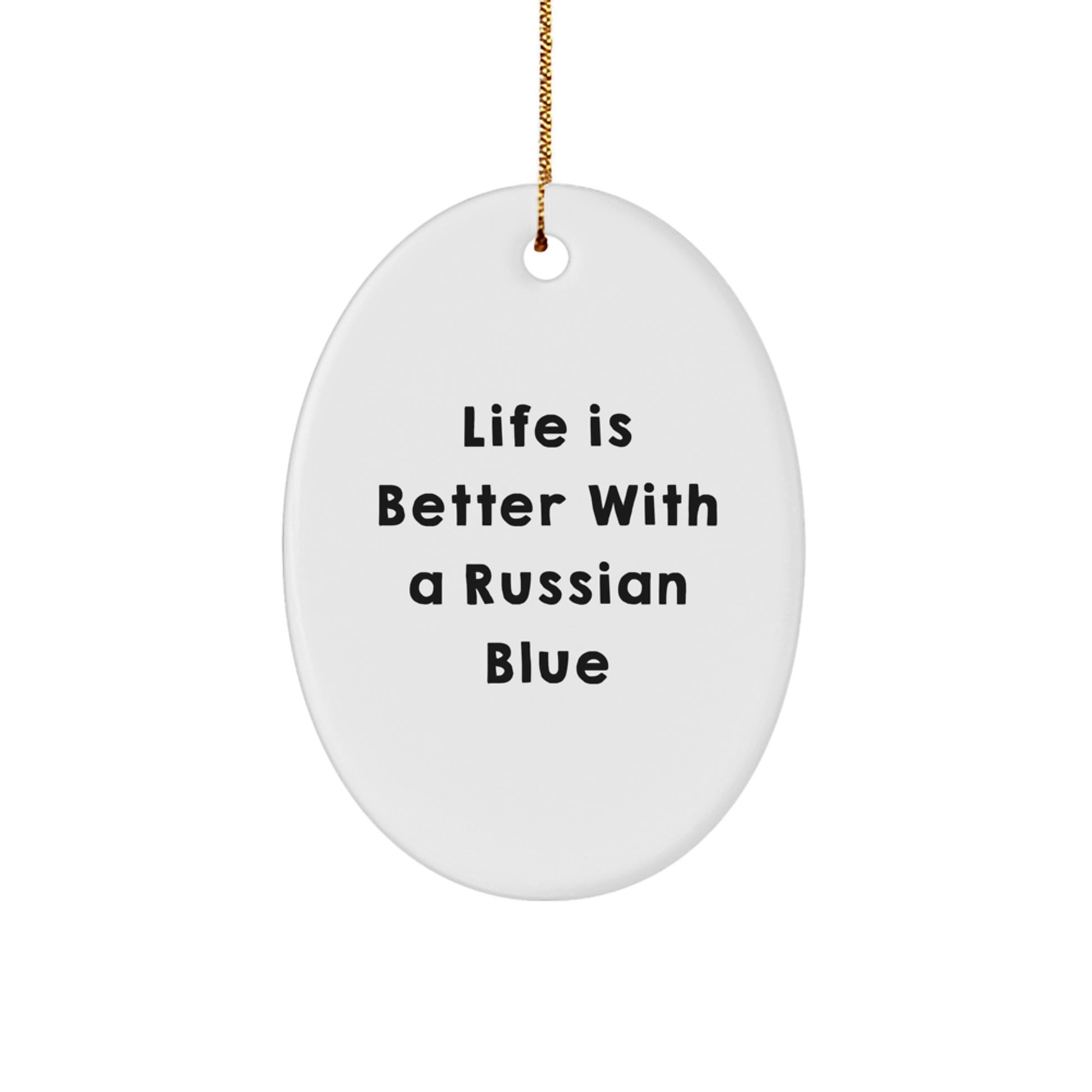 - Nuestro adorno ovalado "La vida es mejor con un gato azul ruso" es una maravillosa adición al hogar de cualquier amante de los gatos azules rusos. Su festivo cordón dorado permite colgarlo fácilmente, perfecto para una decoración sin estrés.