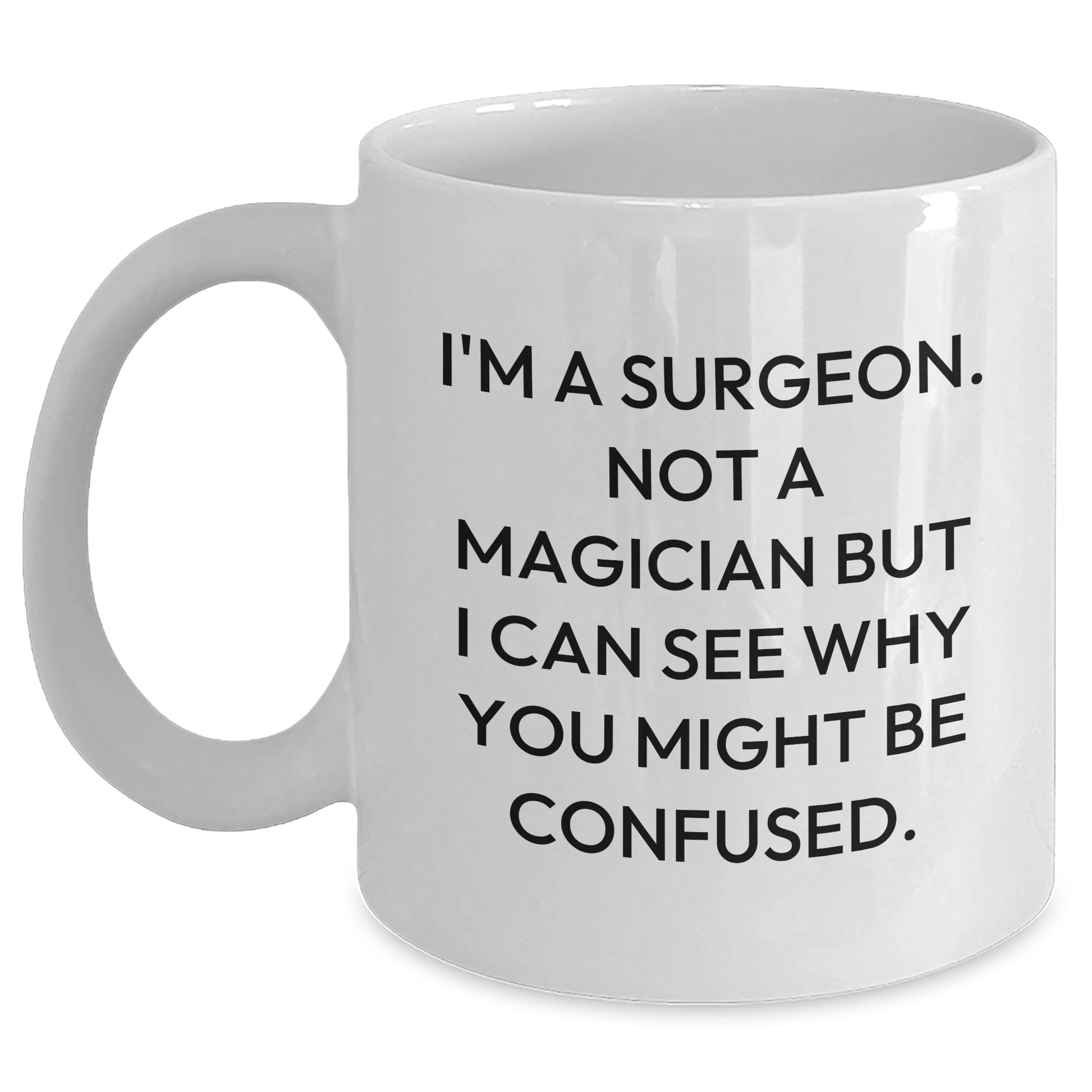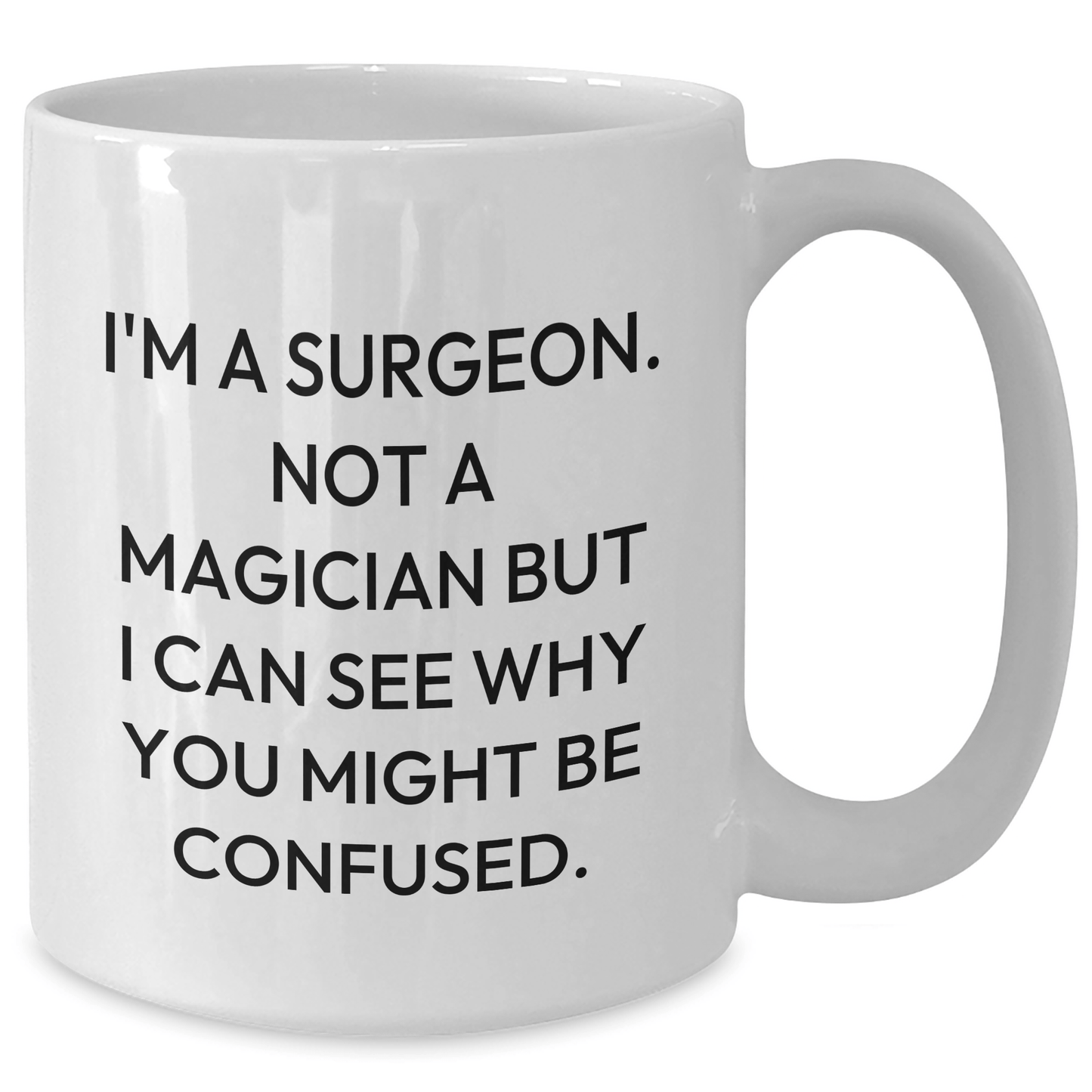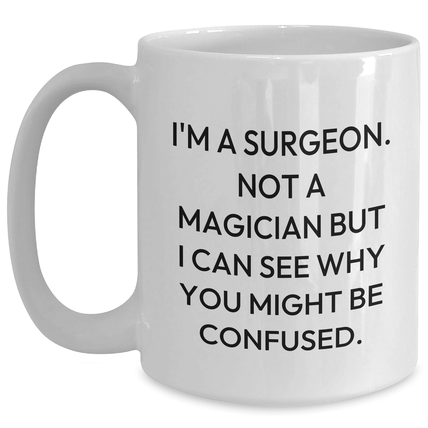 - Esta divertida taza de café blanca es perfecta para celebrar la graduación de un cirujano o cualquier ocasión especial. Incluye la frase "Soy cirujano. No mago, pero entiendo por qué podrías estar confundido".