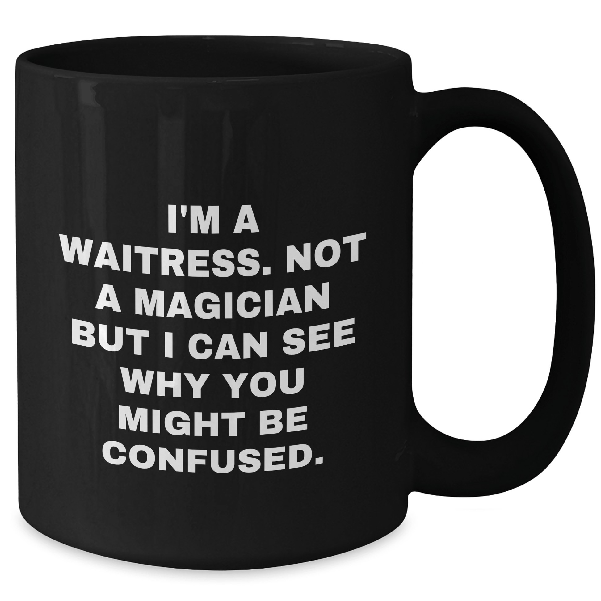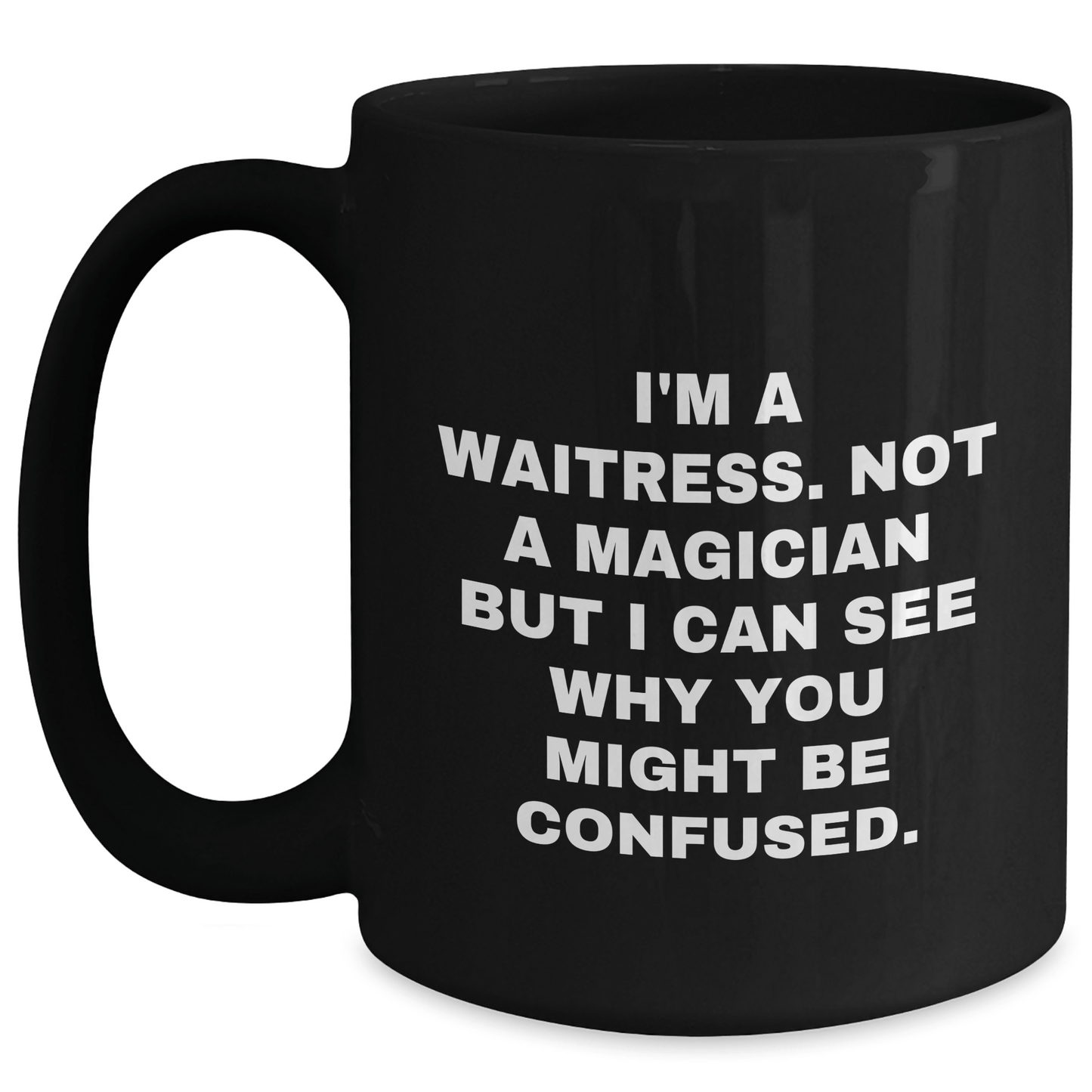 - Consigue hoy mismo tu taza de café negra con la frase "Soy camarera. No maga, pero entiendo por qué podrías estar confundida" y demuéstrale a tu camarera favorita cuánto la aprecias. Es un regalo que atesorarás durante años.