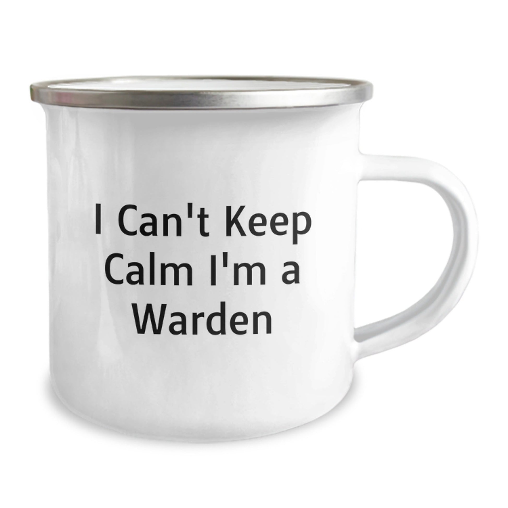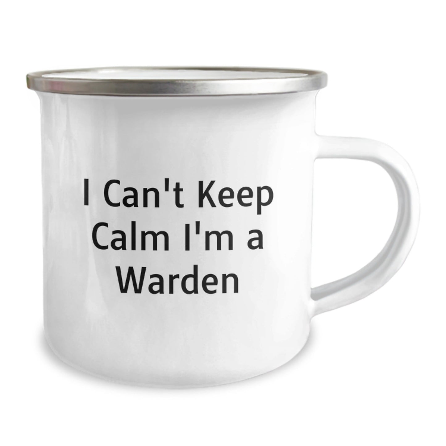 - Prepárese para sus aventuras de Warden con esta taza para acampar de 12 oz, que cuenta con un acero inoxidable duradero con acabado esmaltado que soporta un manejo brusco y garantiza que su cita favorita "No puedo mantener la calma, soy un guardián" se mantenga vibrante e intacta.