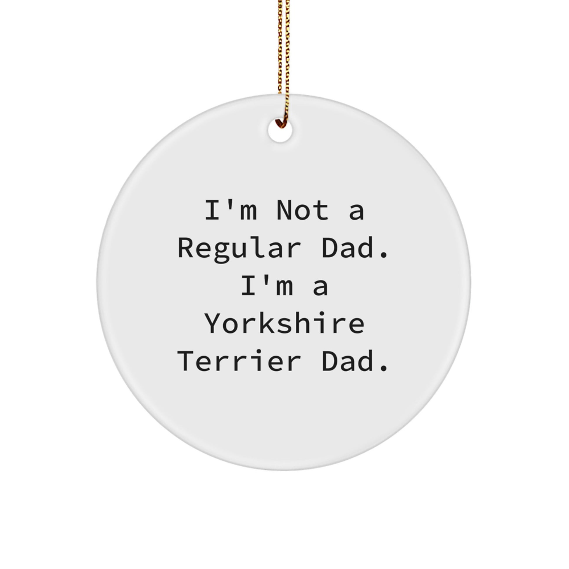- Añade un toque de humor a tu decoración navideña con este divertido adorno circular de papá Yorkshire Terrier, que incluye la frase "No soy un papá normal. Soy un papá Yorkshire Terrier".