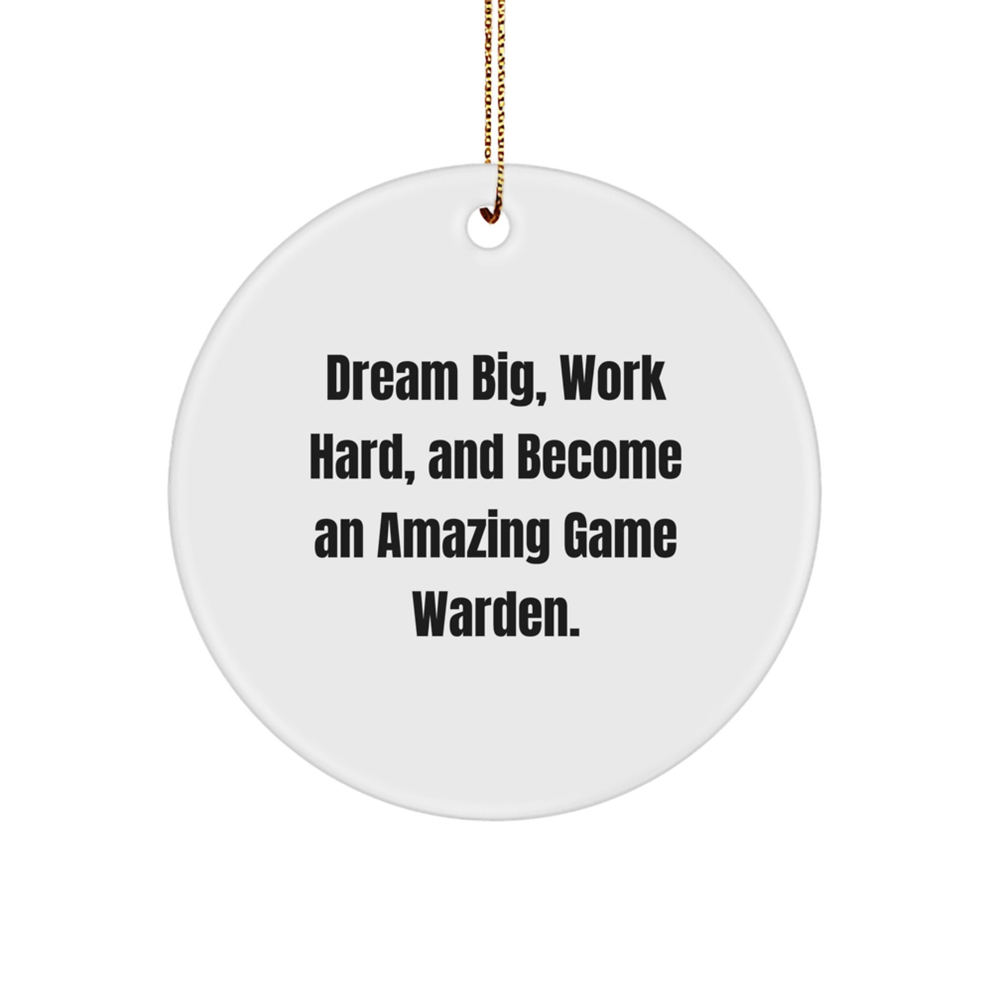 - Inspire the Game Warden in your life with this unique Circle Ornament, featuring the quote 'Dream Big, Work Hard, And Become An Amazing Game Warden.' Perfect for hanging on the Christmas tree or office door, it's a thoughtful gift that will remind them to chase their dreams and work hard to achieve them. Made from sturdy MDF with a high-gloss plastic finish, this Circle Ornament is vibrantly printed from edge-to-edge via Sublimation, ensuring bright, vivid colors that will last a long time.