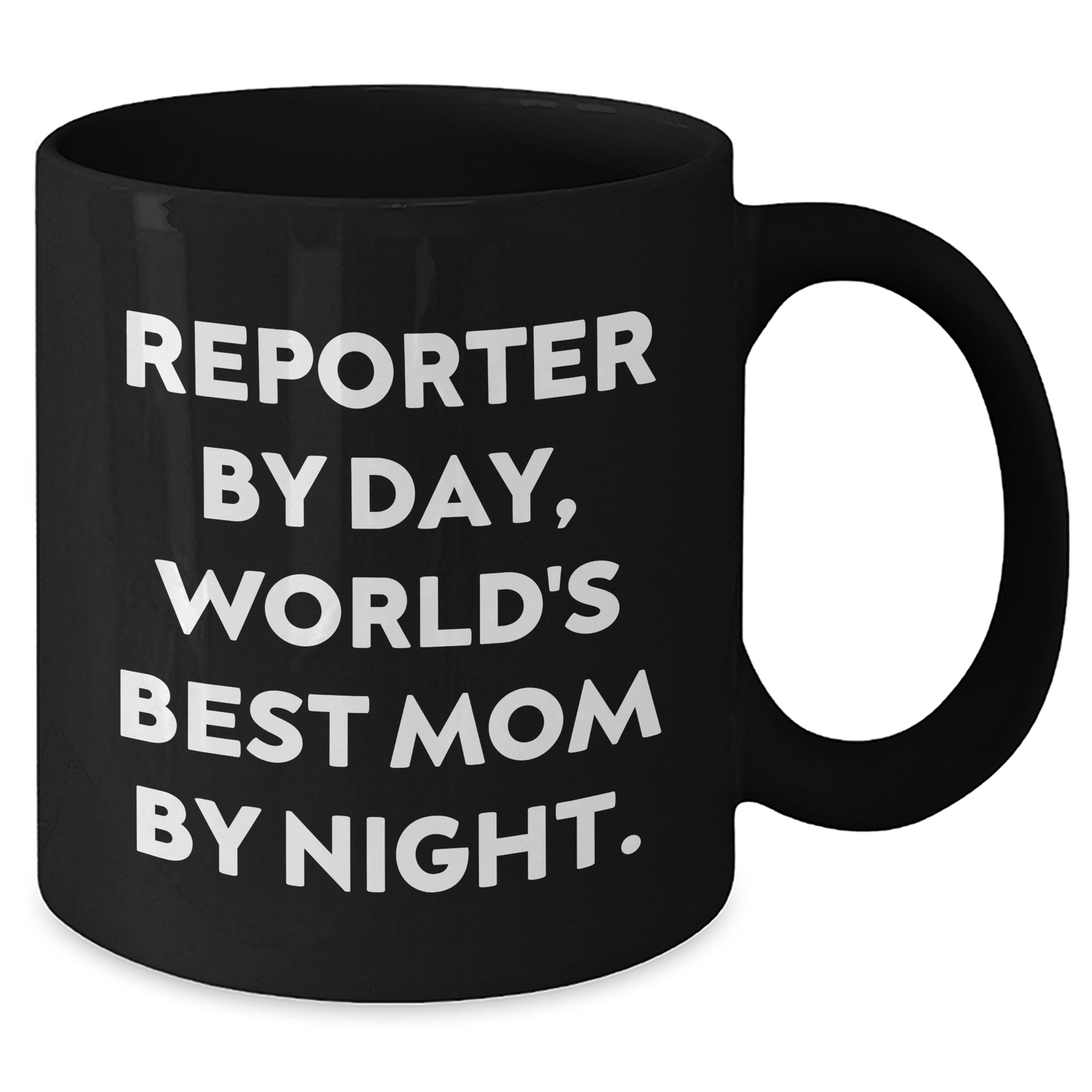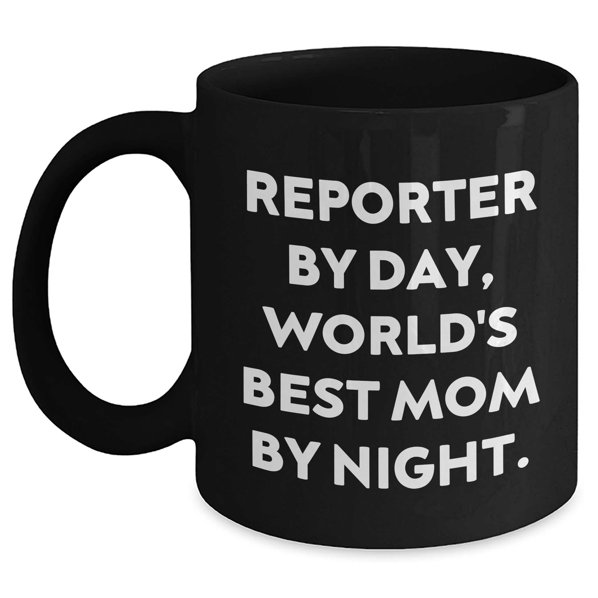 • Our black coffee mug is a great way to showcase your reporter's personality and style. The 'Reporter By Day, World's Best Mom By Night.' quote is a unique and thoughtful touch that will make this mug stand out in any office or home. Perfect for a reporter's desk or as a gift for your favorite journalist.