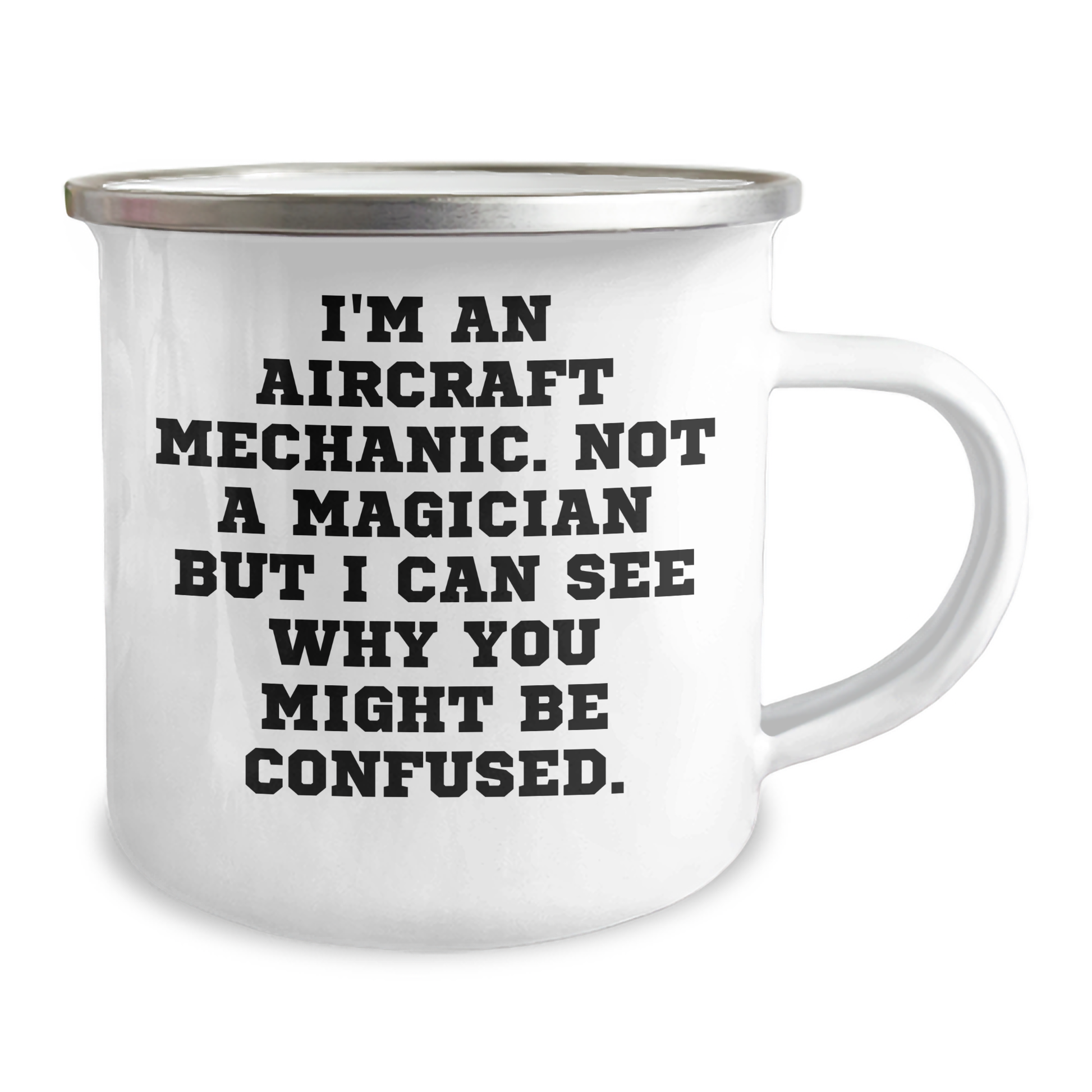 Are you an Aircraft Mechanic or know someone who is? Look no further! This Camping Mug is a great gift for Father's Day or any occasion. As an Aircraft Mechanic myself, I can relate to the quote 'I'm An Aircraft Mechanic. Not A Magician But I Can See Why You Might Be Confused.' - it's a humorous take on the complexity of aircraft mechanics. This mug is not just for show, it's a functional and sturdy Camping Mug made of stainless steel with an enamel finish, holding 12 oz of your favorite beverage.
