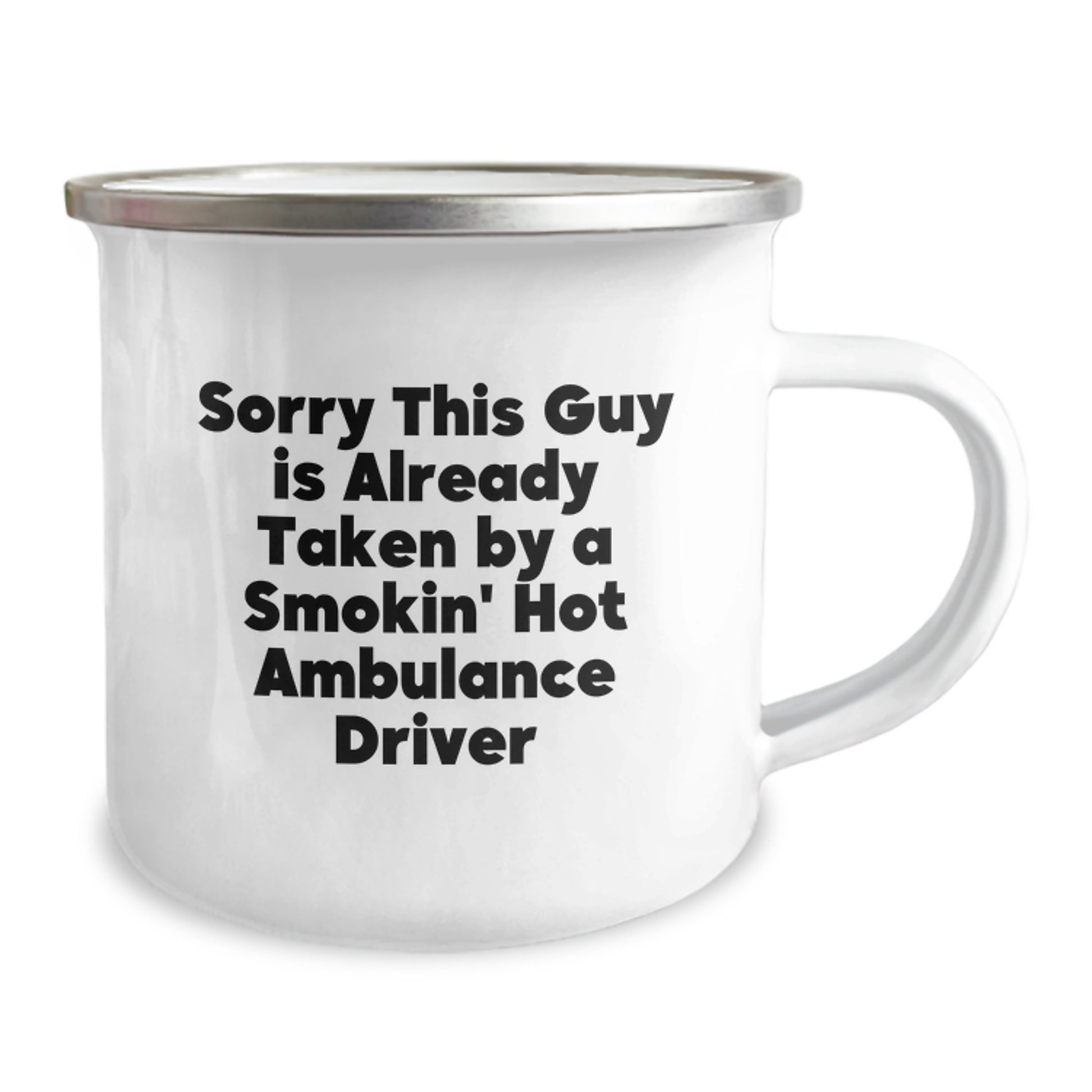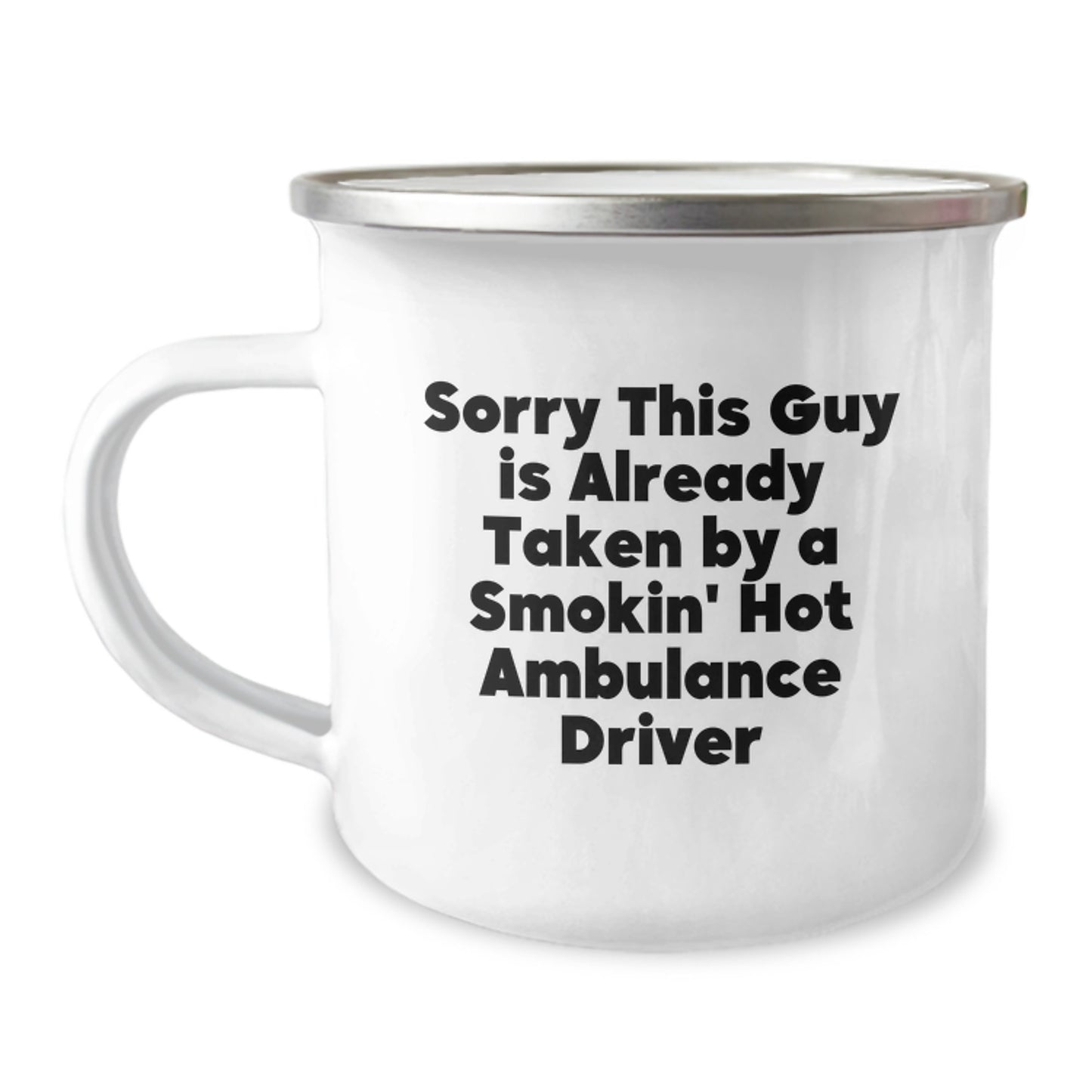 - Celebrate the Ambulance Driver in your life with this unique and funny Camping Mug, featuring the quote 'Sorry This Guy Is Already Taken By A Smokin' Hot Ambulance Driver'.