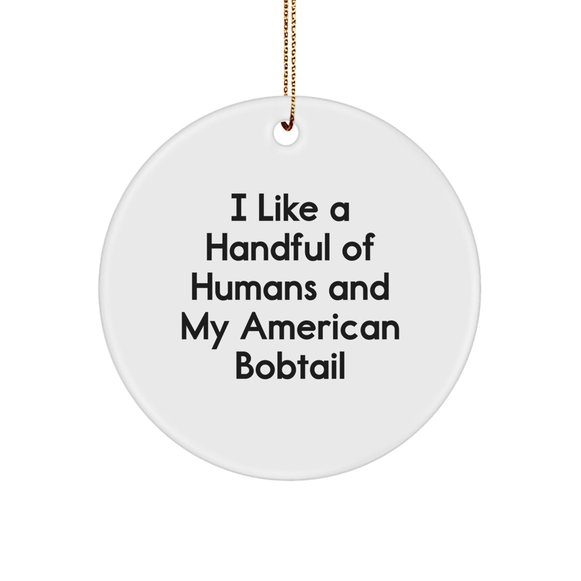 - Meet the American Bobtail Cat, a unique and loving feline friend, now available in a beautiful Circle Ornament. This vibrant decoration is perfect for cat lovers, adding a touch of whimsy to your home or office space, spreading joy and warmth, and making a thoughtful gift for friends and family. With a quote that reads 'I Like A Handful Of Humans And My American Bobtail', this ornament celebrates the special bond between humans and their feline companions.