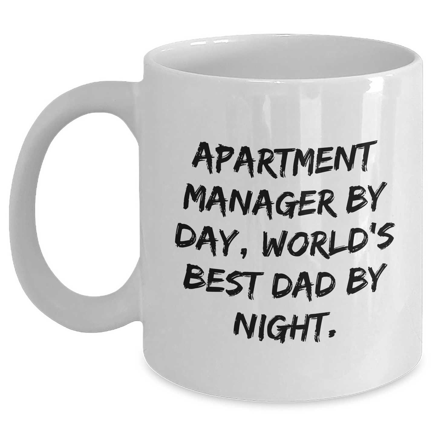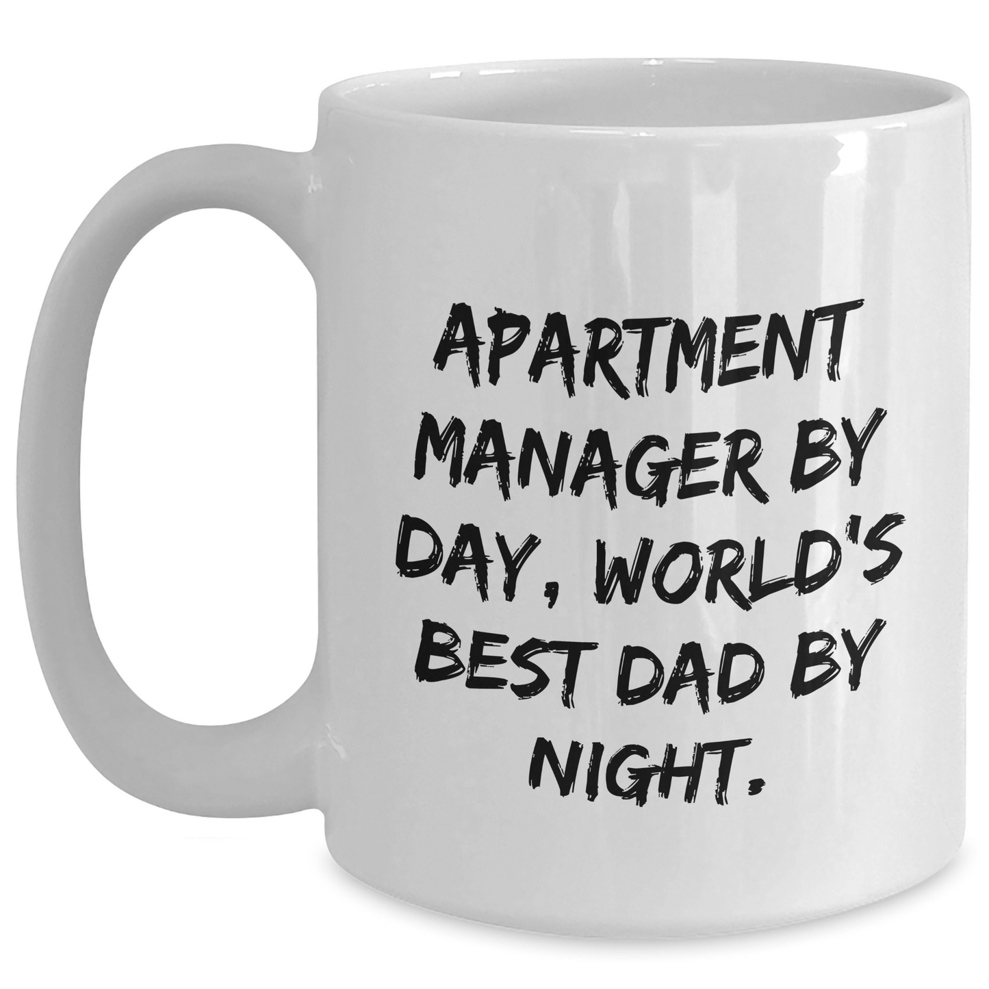 Are you looking for a unique gift for the Apartment Manager in your life? Look no further! This White Coffee Mug features a funny quote that says 'Apartment Manager By Day, World's Best Dad By Night.' and is sure to bring a smile to their face. Whether it's for a graduation, a birthday, or just because, this mug is the perfect way to show your appreciation for all they do. Made from high-quality ceramic, this mug is microwave and dishwasher safe, making it easy to clean and use. With its 11oz or 15oz capacity, it's perfect for hot or cold beverages. Give the gift of a perfect cup of coffee or tea to the Apartment Manager in your life and make their day.
