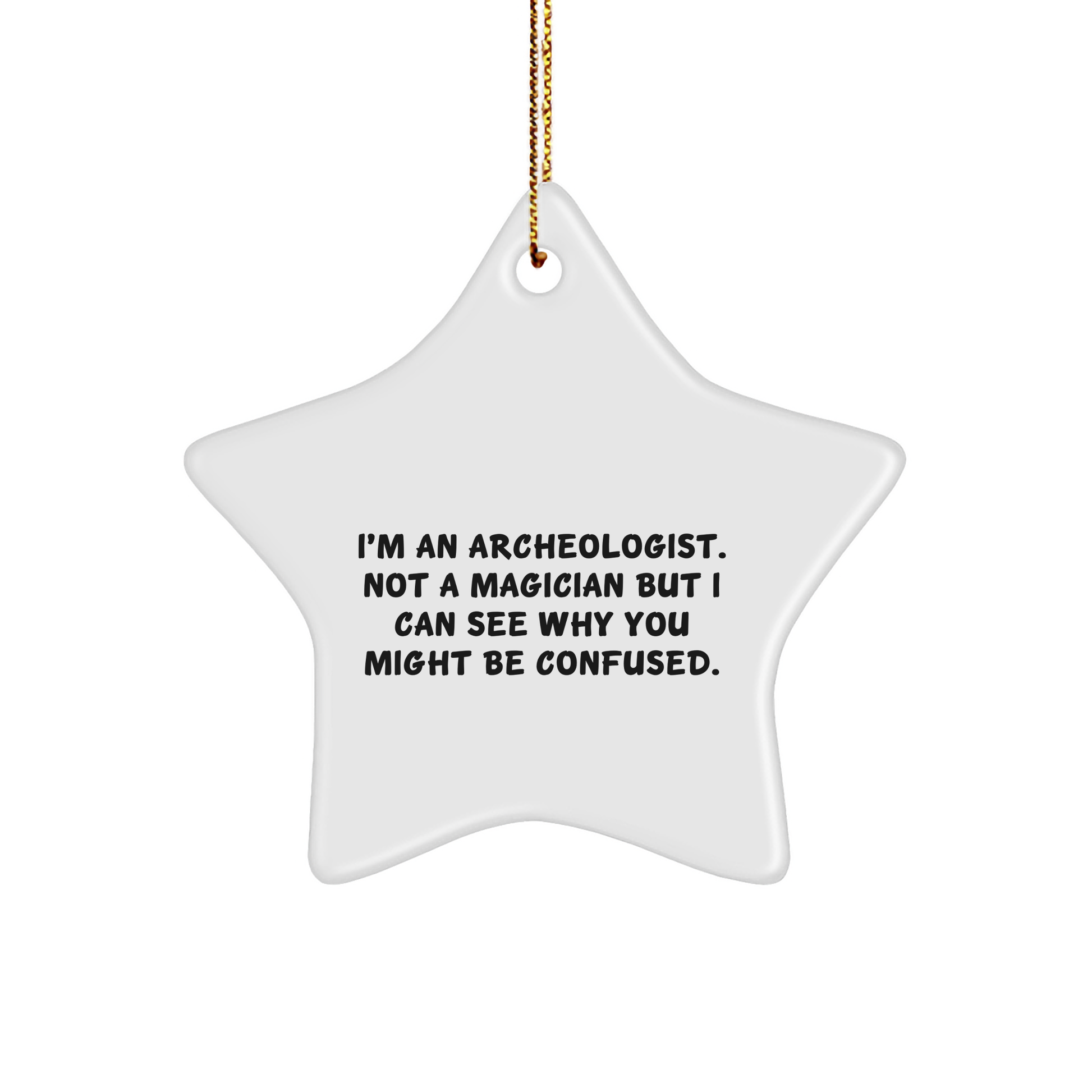 Are you an archeologist enthusiast or looking for a unique gift for the archeologist in your life? This funny quote star ornament is the perfect choice! With a quote that says 'I'm An Archeologist. Not A Magician But I Can See Why You Might Be Confused.', it's a thoughtful and humorous way to show your appreciation for their love of history and discovery. Made from sturdy MDF with a high-gloss plastic finish, this star-shaped ornament is vibrantly printed from edge-to-edge via Sublimation, ensuring bright, vivid colors. It's lightweight and resistant to breaking, making it a great choice for households with children or pets. Plus, it ships with a festive gold cord for easy hanging, perfect for stress-free decorating. Whether you're giving it as a gift or keeping it for yourself, this archeologist star ornament is sure to bring a smile to anyone's face. So why wait? Get your holiday shopping started today and make this Christmas one to remember!