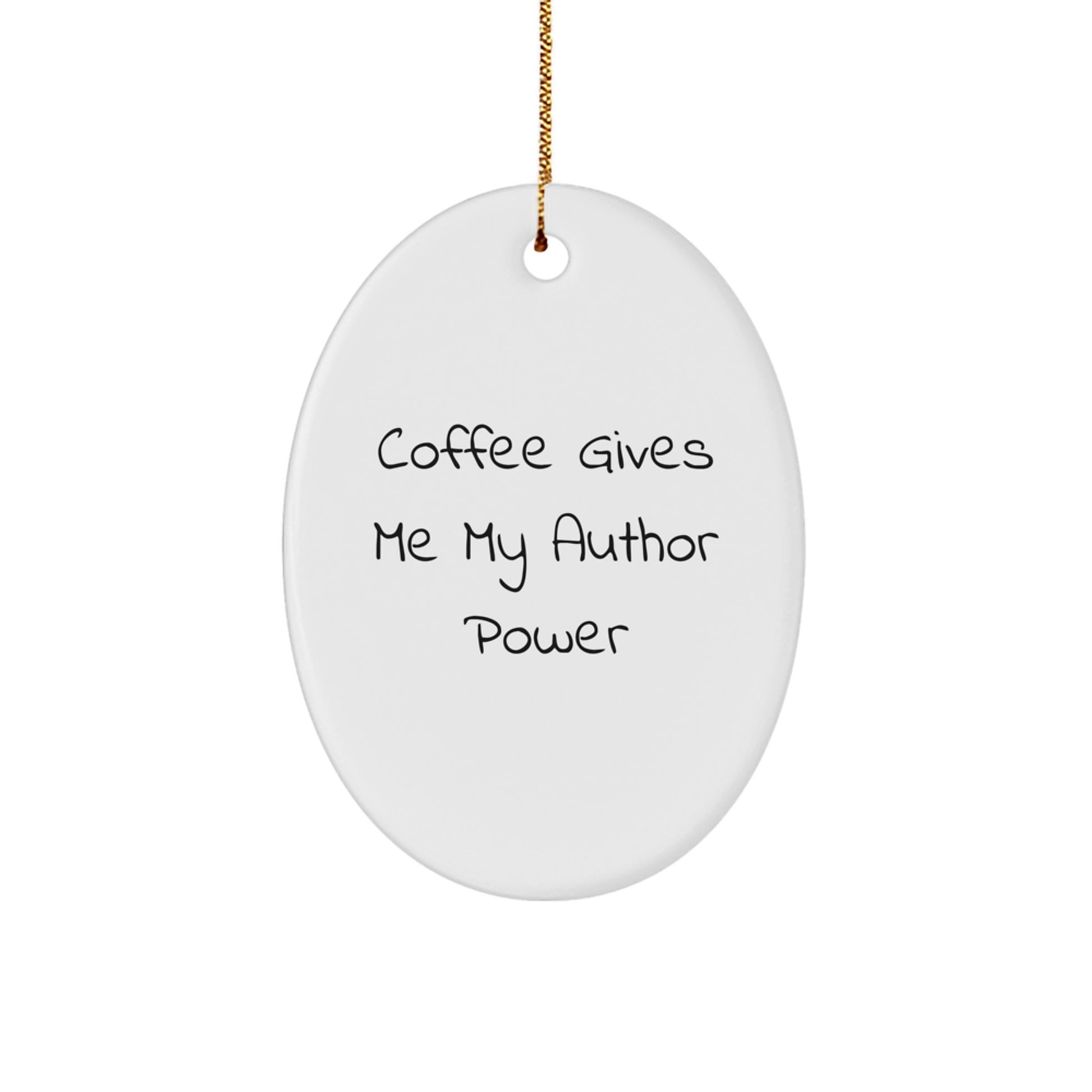 Are you a book lover or know someone who is? This unique oval ornament is the ideal gift for authors and book enthusiasts. The quote 'Coffee Gives Me My Author Power' is a humorous and relatable phrase that will bring a smile to anyone's face. Made from sturdy MDF with a high-gloss plastic finish, this ornament is lightweight and resistant to breaking, making it a great choice for households with children or pets. The vibrant colors will add a pop of color to any Christmas tree or mantel. Whether you're a writer, a reader, or just a coffee lover, this ornament is a thoughtful gift for the author in your life. Give the gift of laughter and creativity this holiday season!
