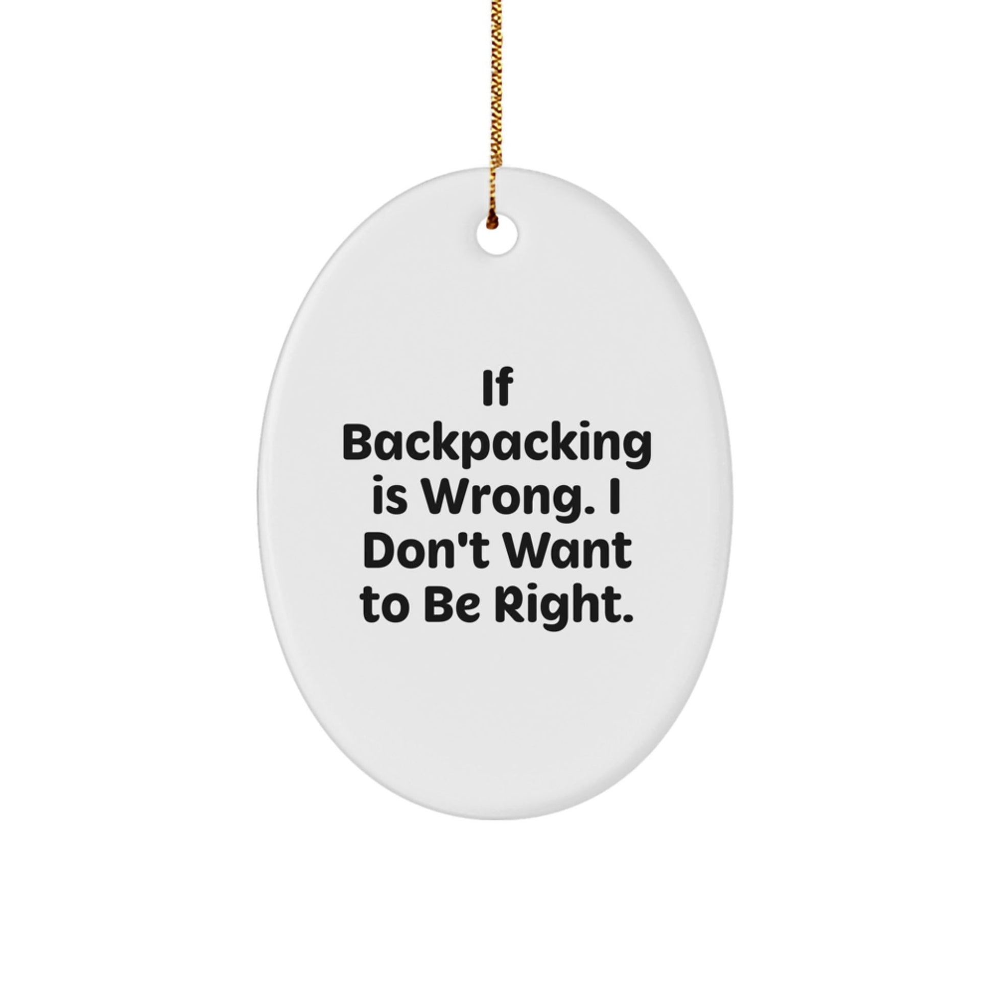 - This funny oval ornament is a unique and thoughtful gift for any backpacking enthusiast, featuring a quote that says 'If Backpacking Is Wrong. I Don't Want To Be Right.'