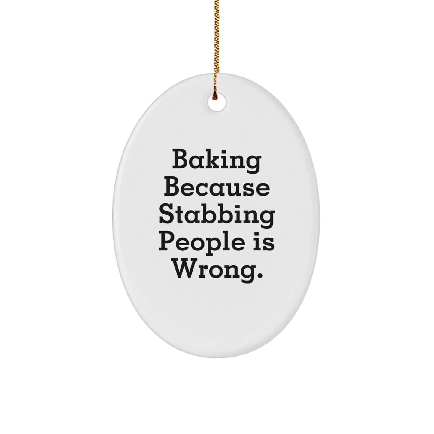 Looking for a unique gift for the baking enthusiast in your life? This funny oval ornament is the perfect addition to their kitchen or holiday decor. With its vibrant colors and sturdy construction, it's sure to bring a smile to their face. Whether you're a friend, family member, or coworker, this gift is sure to be a hit. So why settle for a boring, generic gift when you can give something that shows you put thought into it? This 'Baking Because Stabbing People Is Wrong.' oval ornament is a one-of-a-kind gift that will be treasured for years to come.