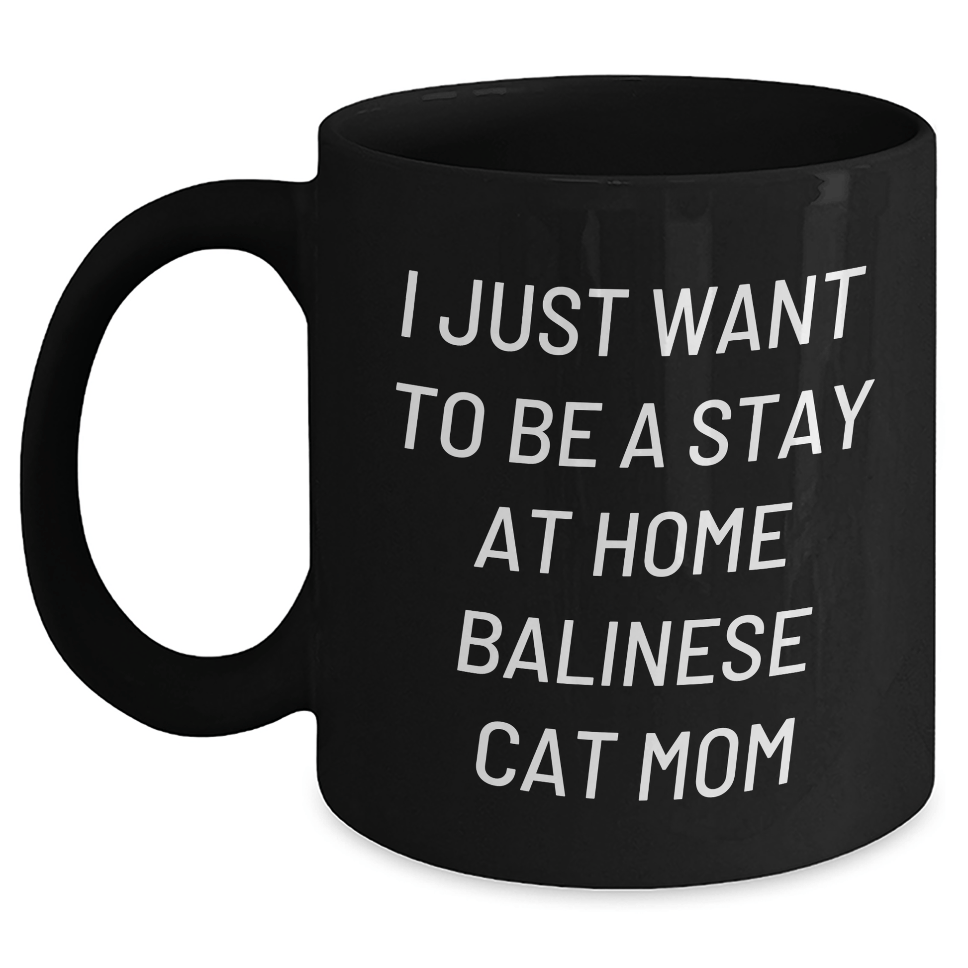 - This Black Coffee Mug is a unique and thoughtful gift for any Balinese Cat lover, featuring the funny and relatable quote 'I Just Want To Be A Stay At Home Balinese Cat Mom'.